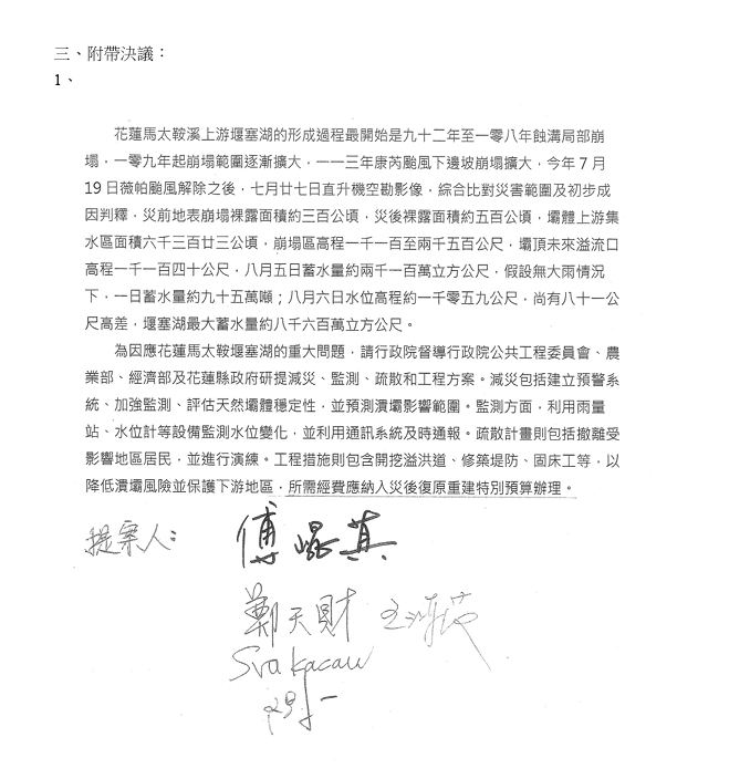 他最後重申,堰塞湖災情不容卸責,中央應明確說明管理責任與應變作為,並與地方攜手面對災後重建挑戰。