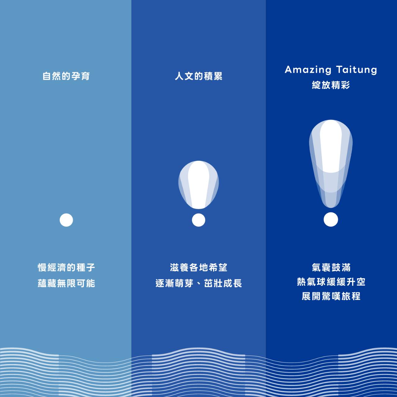 規劃與設計團隊表示,輔助圖形則延伸自主標誌意象,透過流動曲線與線條密度的層次編排,轉化臺東綿延壯麗的山巒、翻湧奔騰的海浪,以及熱氣球於山海間緩緩升起的姿態,營造出與自然相映的靜謐美感,進一步深化整體品牌視覺語言的敘事層次。