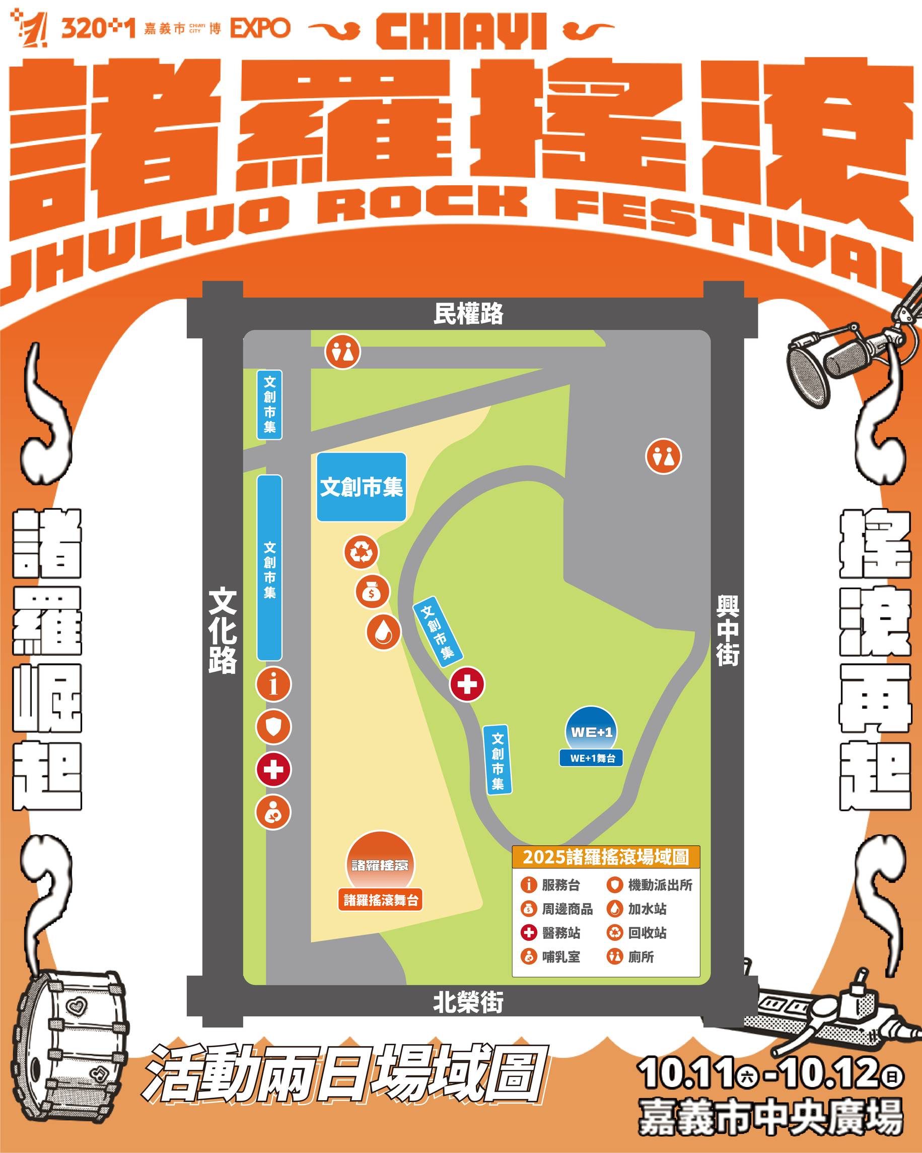 本屆音樂祭首度移師嘉義市中央廣場舉辦,讓搖滾音樂更貼近民眾。主、副舞台輪番開唱,現場更推出限定特色市集,匯集文青選物、手作創意、美食餐車與沁涼飲品,讓民眾在享受音樂的同時,也能盡情品味在地風情。場地鄰近嘉義文化路夜市,參與者可在看演出的同時順遊夜市,品嚐道地特色美食,感受嘉義市最熱鬧的城市氛圍。