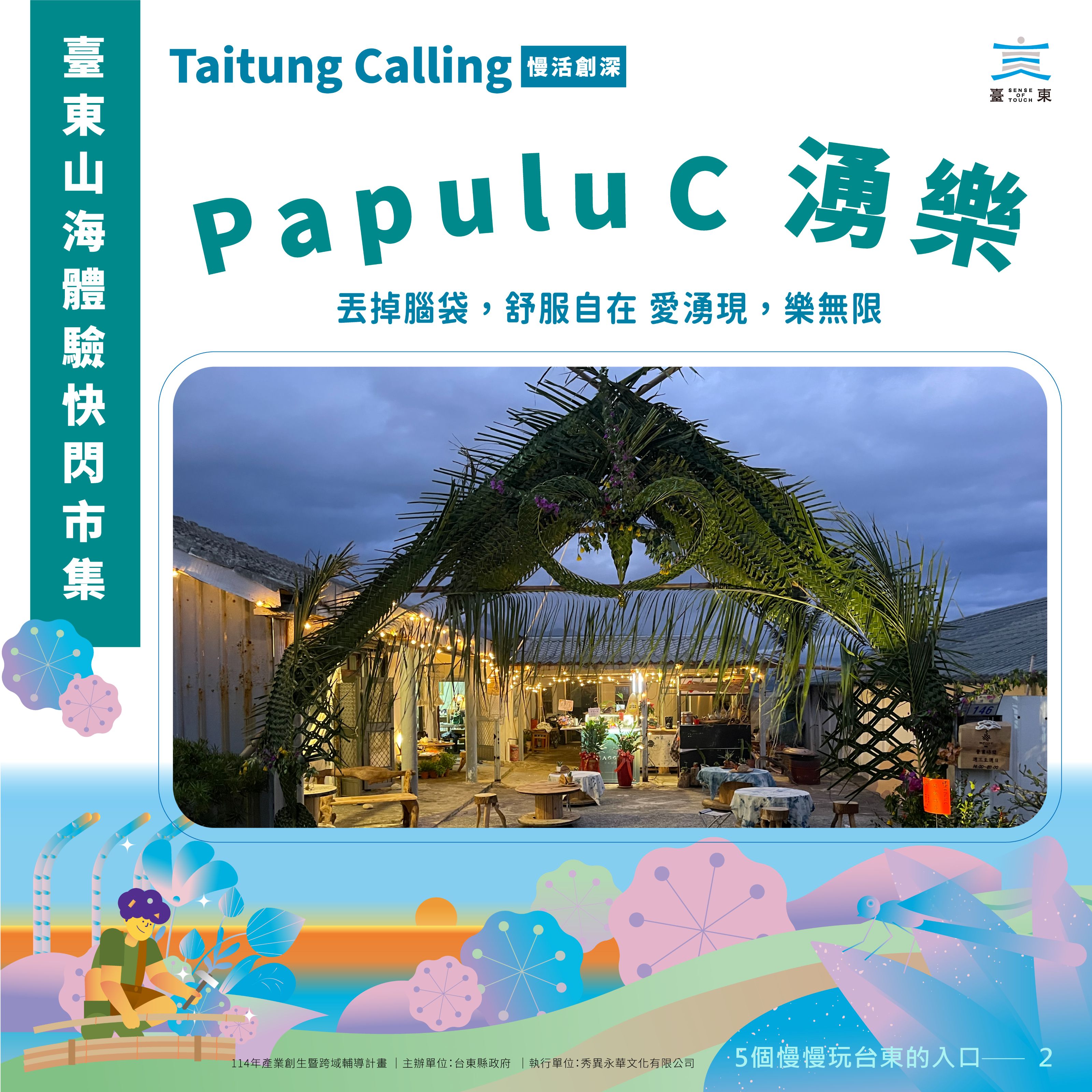 臺東縣政府推動「慢活創深」產業創生暨跨域輔導計畫,去年度以「DIG DEEP TAITUNG」為核心,強調深度挖掘在地文化,今年則以「Taitung Calling」為主題,象徵臺東已經準備好,帶著滿滿的好玩體驗與在地魅力,邀請呼喚大家走進臺東、親身感受。縣府將於10月11日、12日國慶連假期間,在台北圓山花博園區 MAJI MAJI集食行樂玻璃屋廣場,舉辦【臺東山海體驗快閃市集】,讓大家在活動中感受臺東慢生活的熱情與能量。