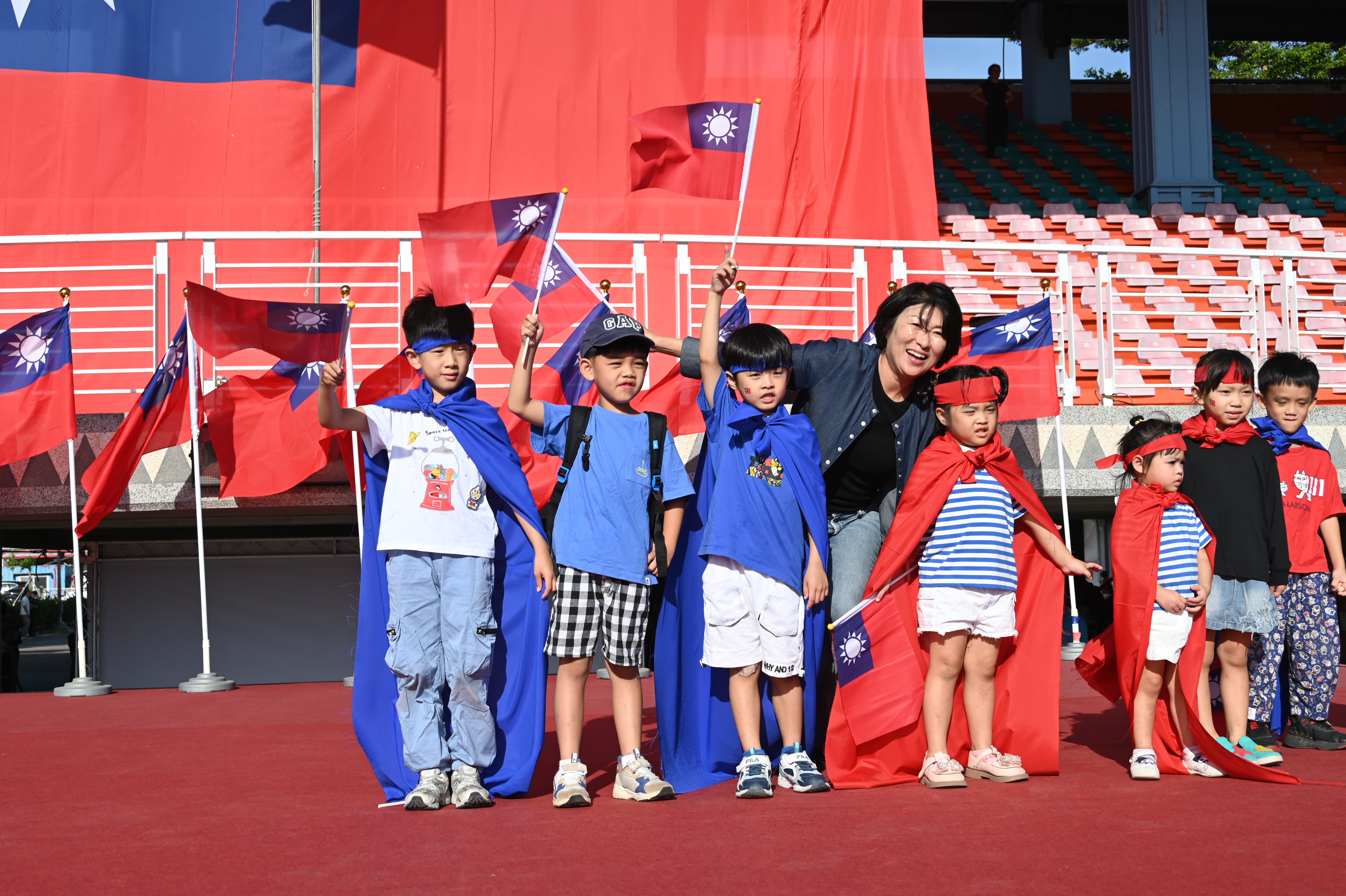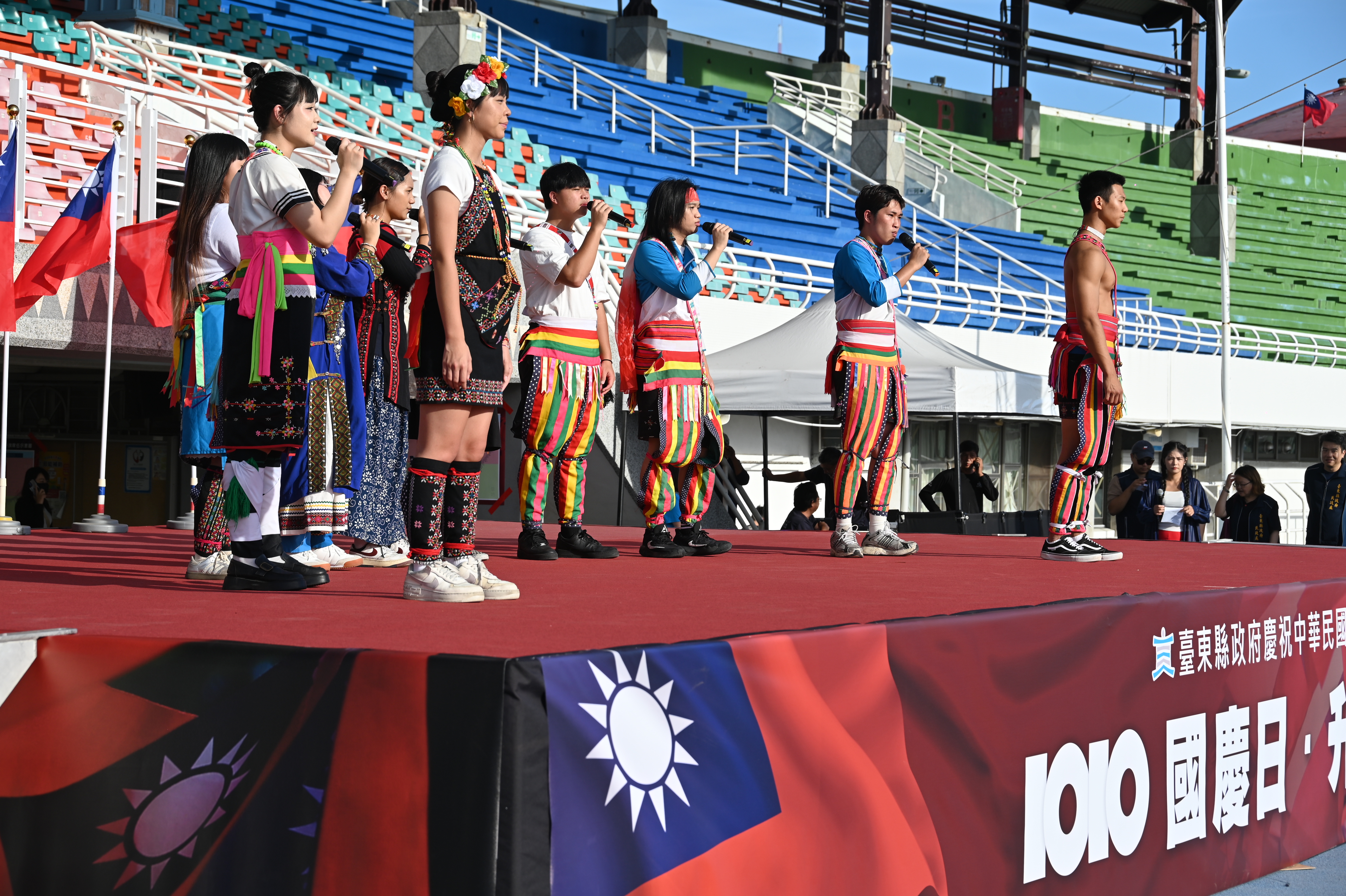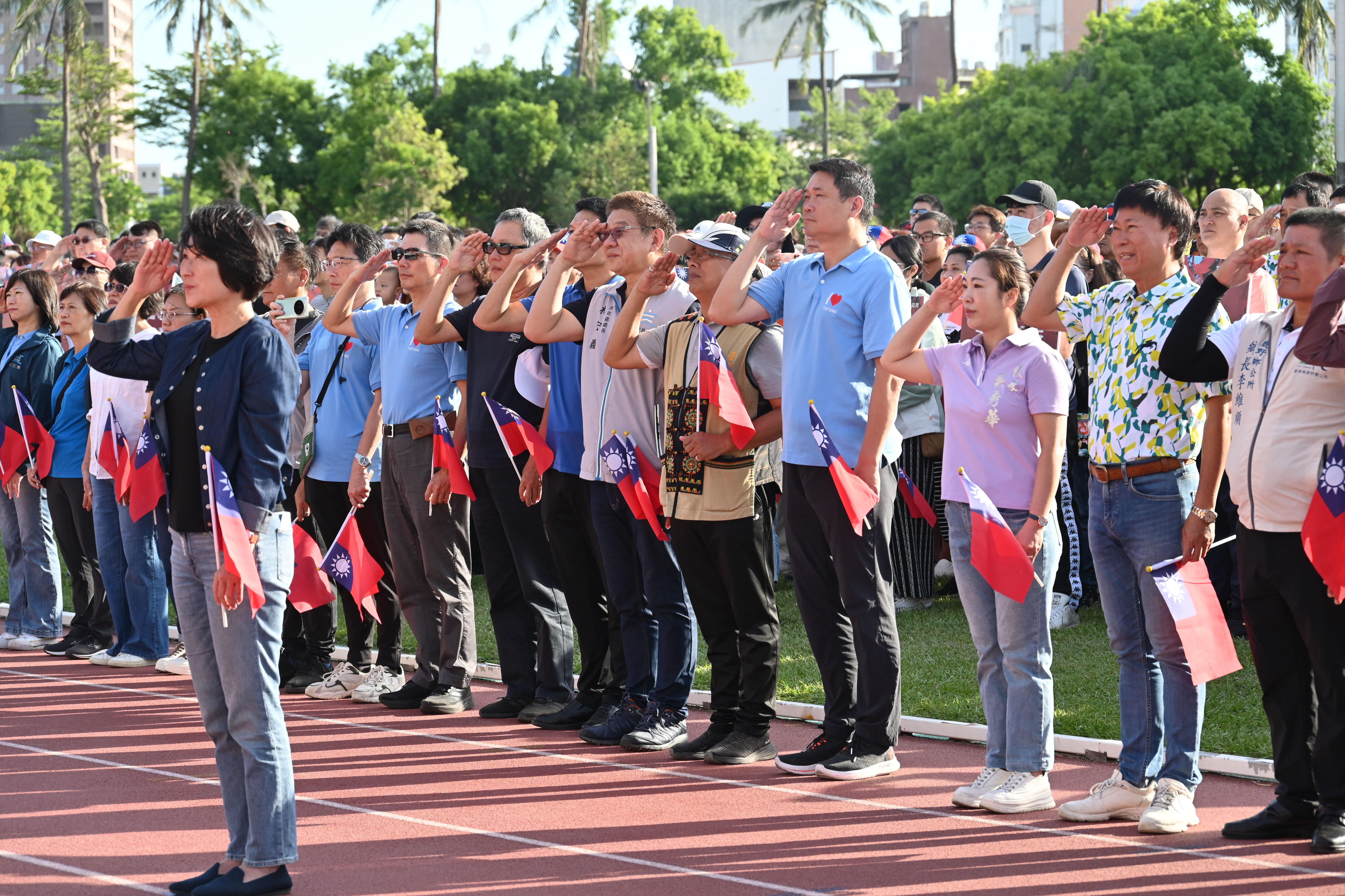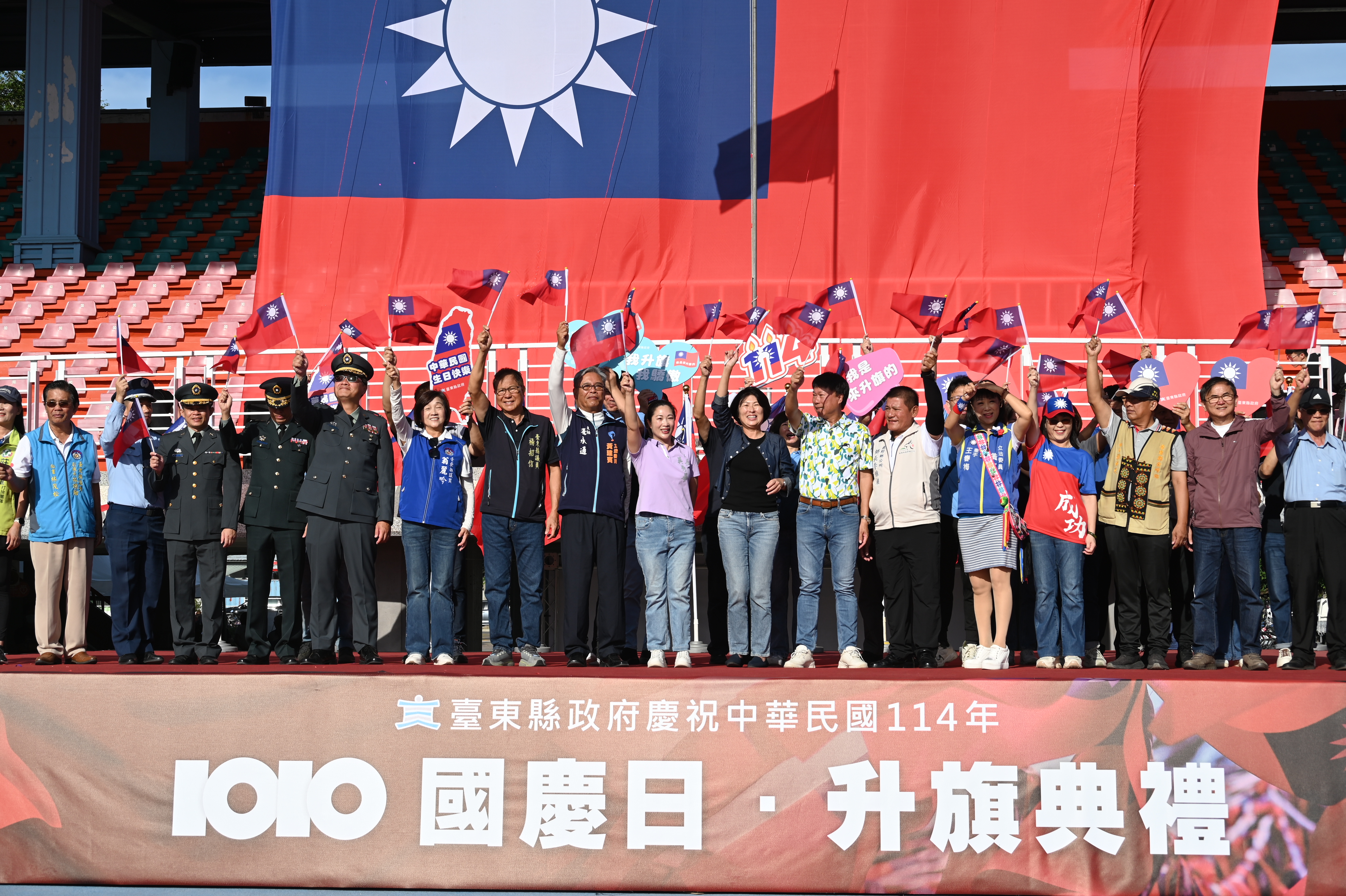 臺東縣政府於今(10)日在縣立體育場,辦理慶祝中華民國114年雙十國慶升旗典禮,現場湧入約3,000名鄉親,熱情揮舞國旗,熱烈參與。縣長饒慶鈴帶領民眾高唱國歌,祝賀中華民國國慶日。