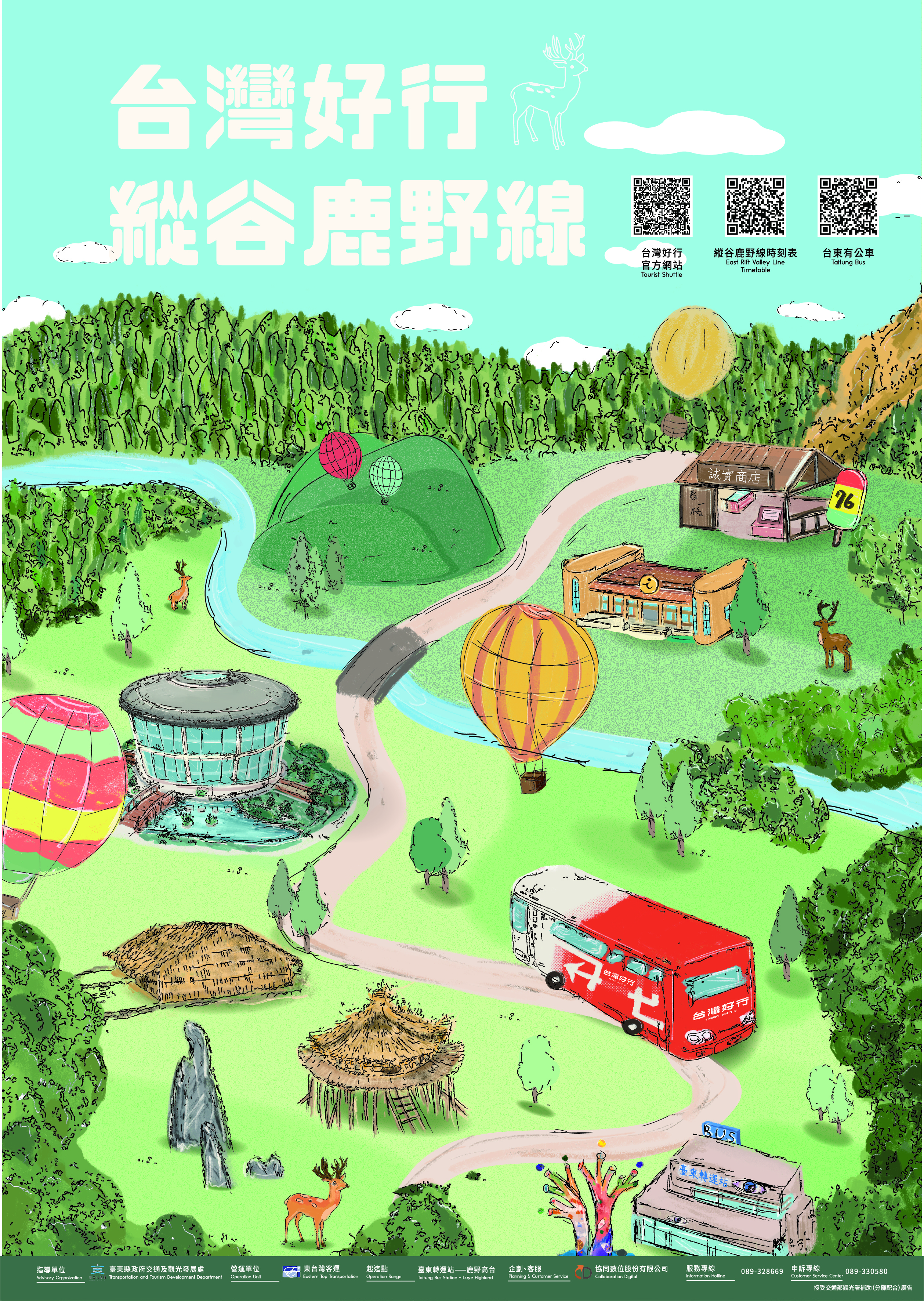 臺東縣政府表示,縱谷鹿野線採「郵輪式公車」營運方式,每日兩班,分別於早上8:00及下午1:40從臺東轉運站發車,時刻表可上官網查詢:www.ttdiway.com ,沿途停靠公教會館、娜路彎大酒店、台東火車站、卑南遺址公園、原生應用植物園、四維及鹿野高台等站點,回程經鹿野遊客中心返回臺東轉運站。沿線各站皆安排停留時間,並有導覽老師隨車講解,讓旅程更豐富有深度。