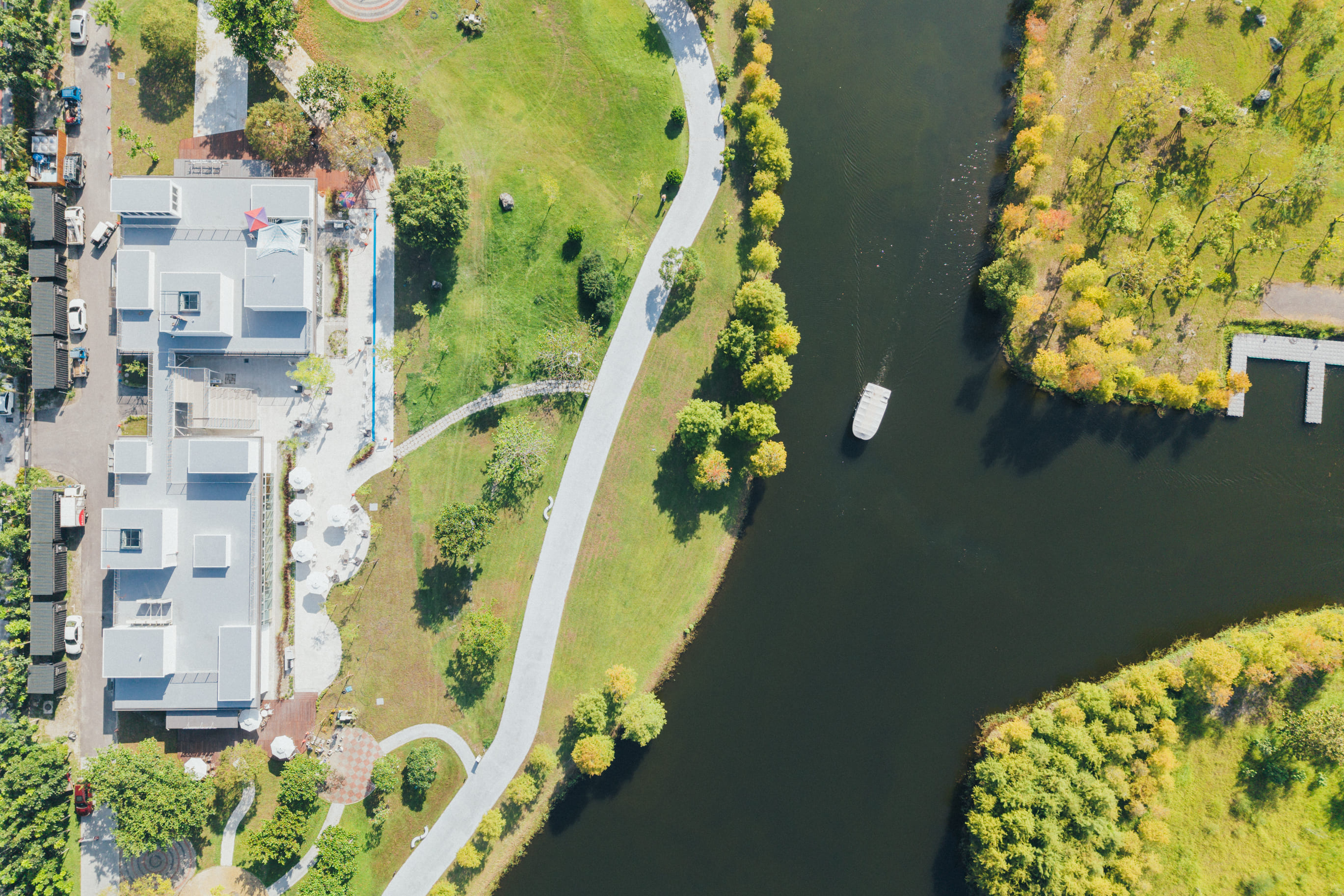 純白建築臨湖而立,大片窗景引入自然光影與山嵐湖景,室內以木質層架與手工鐵件營造溫潤氛圍,中央擺放象徵品牌精神的復古三輪車,彷彿一座隱身山水之間的生活美術館。開幕主視覺由日本導演宮下直樹拍攝,透過濃烈敘事風格捕捉花蓮日常,傳遞「人情美、物產好」的品牌信念。