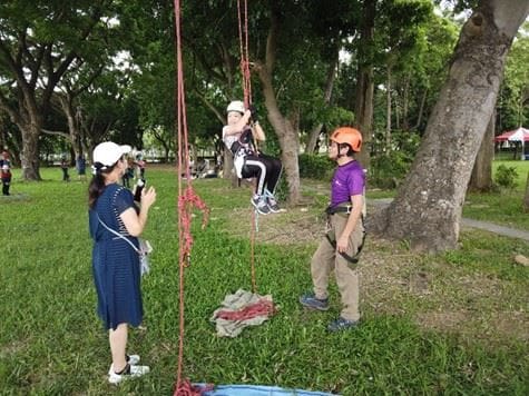 國立嘉義大學森林暨自然資源學系聘請專業教練挑選堅固適合大樹,透過教練和安全設備輔助,讓大人小孩都能安全開心的體驗,除了發揮身體協調性,也能增加親子互動及挑戰自我。
