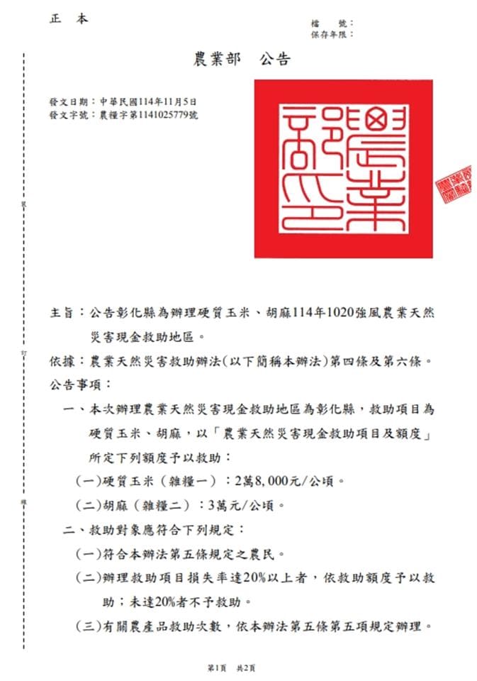 此篇文章最開始出處為: 經農業部公告本縣因「114年1020強風」致硬質玉米及胡(芝)麻受損已符合農業天然災害現金救助標準,114年11月6日起至11月19日前符合規定農民朋友請儘速申請救助