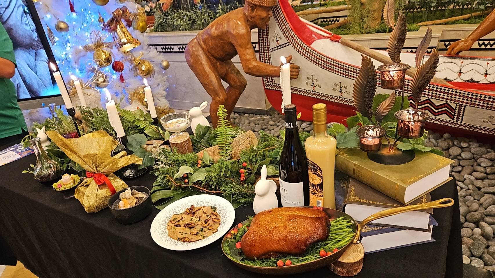 湯品〈黑湯鍋.地之潤〉以黑色系食材與根莖香氣為主軸,濃郁深沉,象徵土地孕育的力量。米食〈稻光之饗〉以在地契作稻米為主體,搭配部落香料與煙燻風味,呈現稻浪閃耀的視覺與味覺意象。
