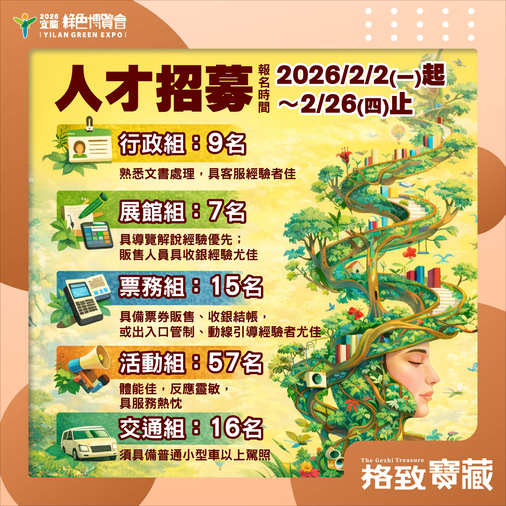 獲錄取人員須全程參加3月24日辦理之培訓課程及各組別教育訓練,以確保展會期間服務品質與專業一致性;如通過甄選卻未能參訓,將視同放棄錄取資格。宜蘭綠博「格致寶藏」徵才開跑 釋出百名職缺