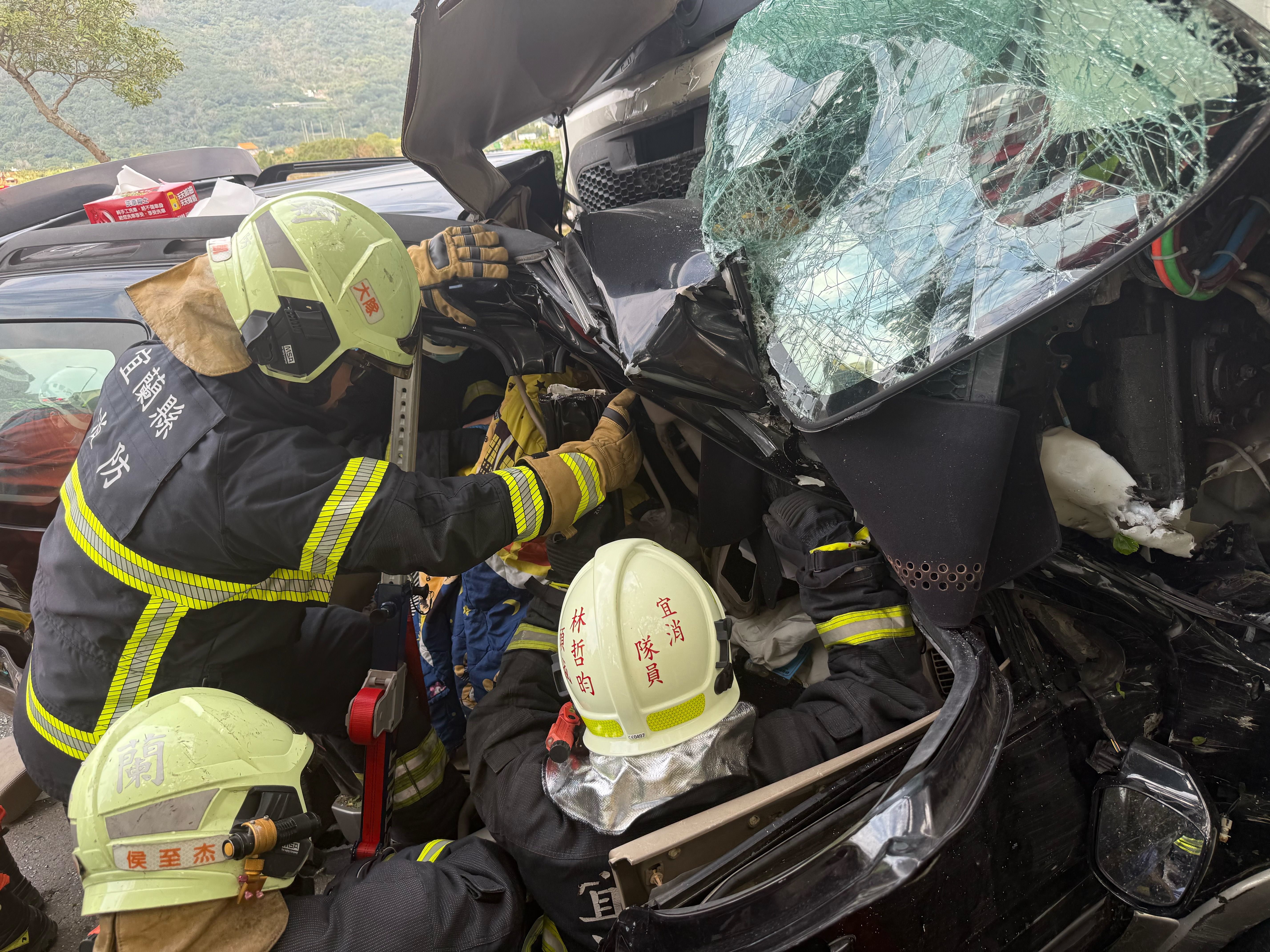 消防人員趕到現場後,得知後座有孩童後,立刻出動破壞器材,分別先將9歲女童及8歲男童救出,2人各有右腹部及左耳疼痛,意識清楚。另外,卡在副駕車內的李女近12時獲救,僅左腳疼痛;遭砂石車左側撞擊、首當其衝的駕駛雷男,直至12時50分才脫困,所幸也僅雙腳疼痛。4人均送往陽大附醫就醫,意識清楚。