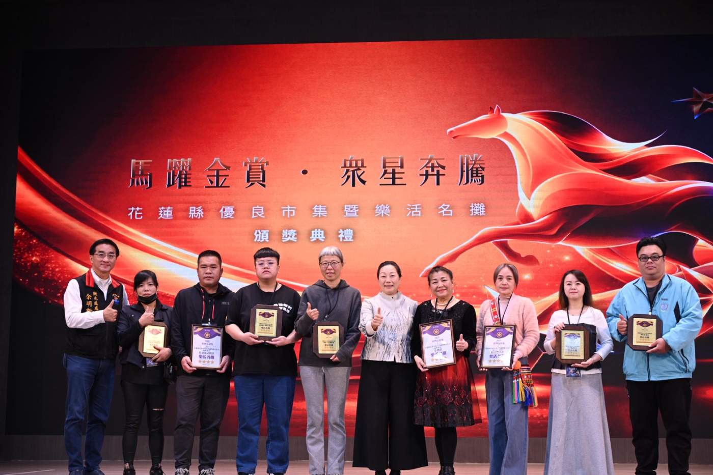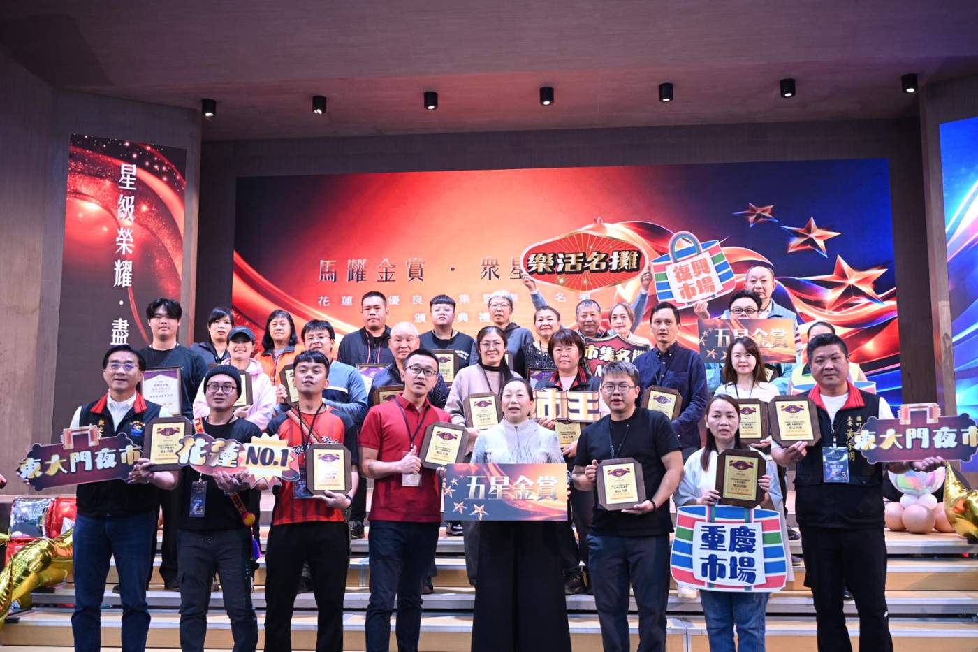 花蓮縣政府於昨(10)日在吉安國小活動中心舉辦「優良市集暨樂活名攤」頒獎典禮,由縣長徐榛蔚親自表揚獲獎攤商,慶祝花蓮市集與攤位在經濟部評鑑中取得突破性的歷史佳績。本次評選中,花蓮全縣總計狂捲 914 顆星,其中最耀眼的莫過於東大門夜市,不僅高居東部第一,更是 2025 年度全國唯一晉升「五星金賞」最高榮譽的市集。此外,花蓮市的中山市場與復興市場也獲得二星優良市集肯定,傳統菜市場攤商透過美學改造與品質提升,成功打破大眾對傳統市場的既定印象,與觀光夜市攜手構築出強大的庶民經濟品牌。
