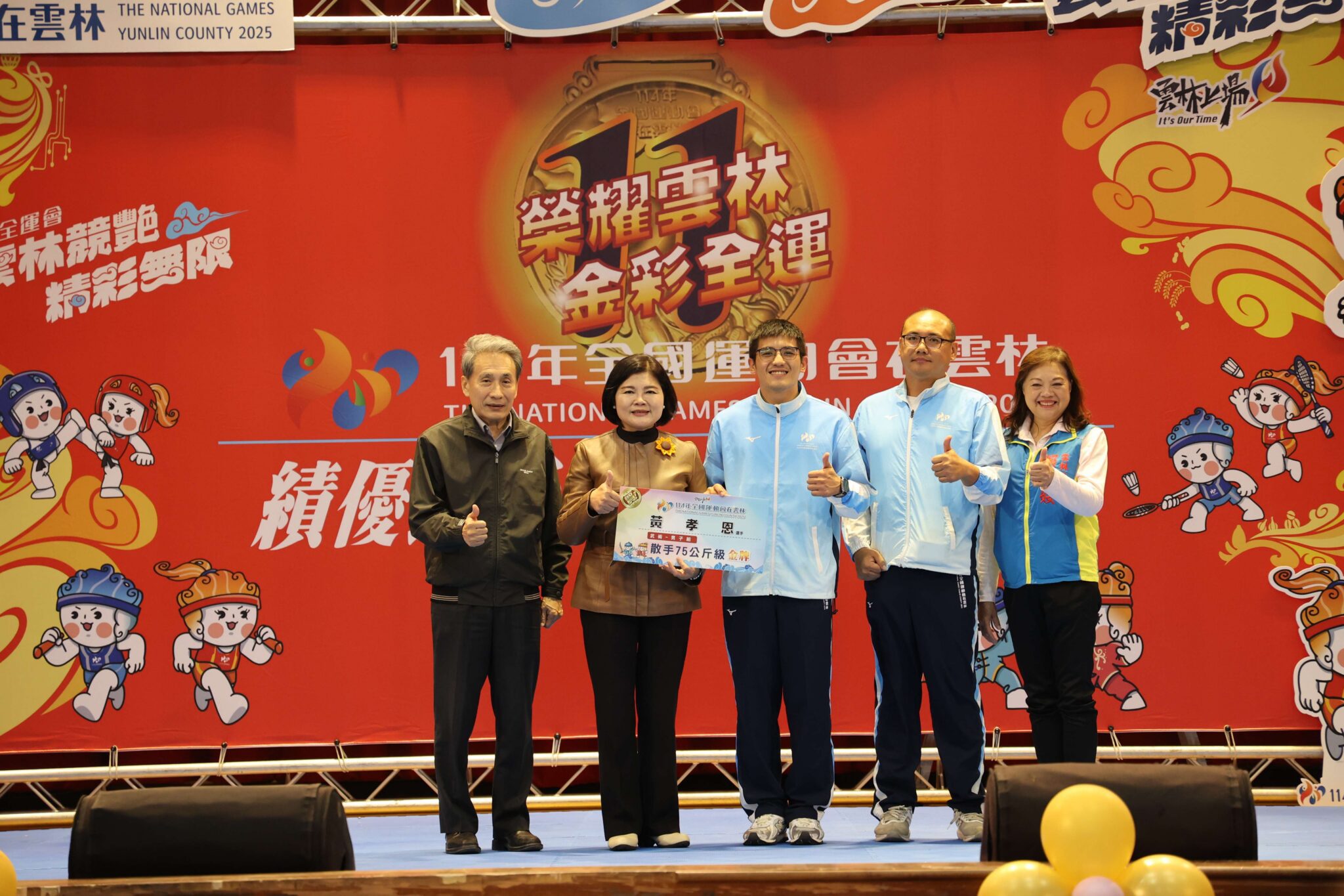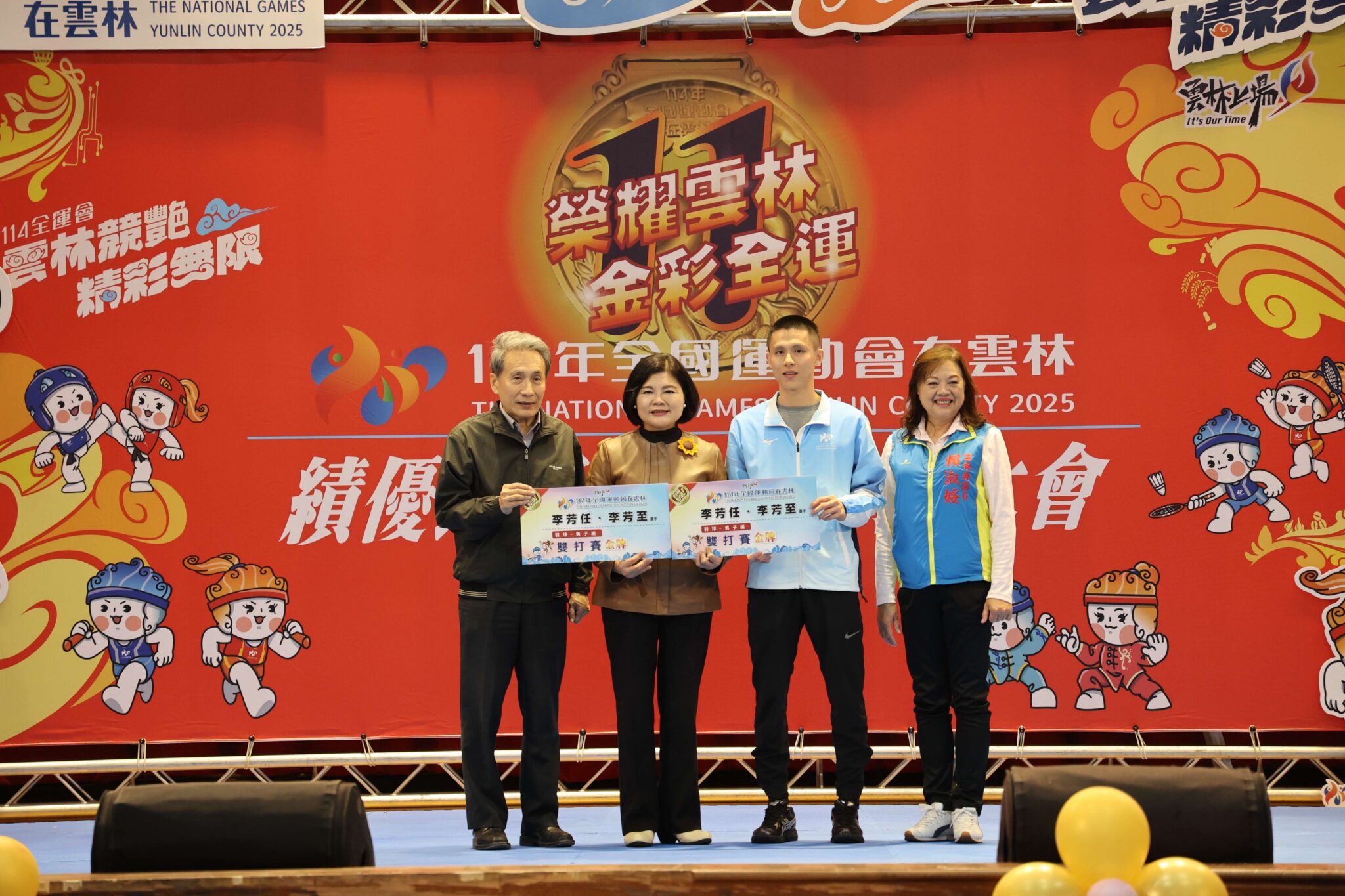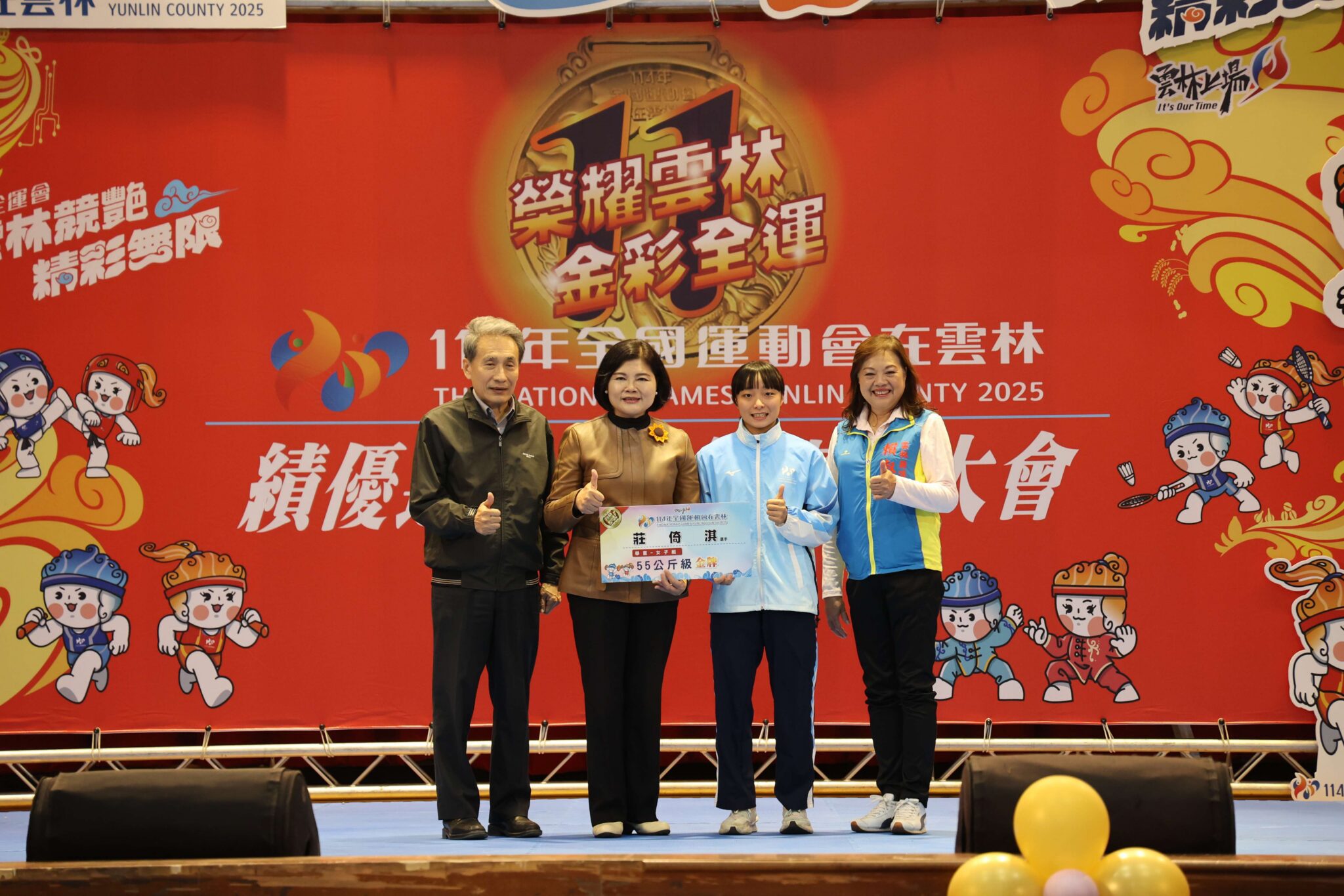 張麗善縣長指出,此次,雲林縣代表隊一共獲得11金5銀9銅,男子組田徑鏈球沈智陞蟬聯金牌、女子組田徑跳高張喬茵金牌、男子組羽球雙打賽雙胞胎兄弟李芳任、李芳至不負眾望榮獲金牌、男子組武術散手75公斤級黃孝恩金牌,男子組柔道賽第六級蔡杰恩榮獲金牌,女子組舉重55公斤級莊倚淇榮獲金牌,跆拳道對打項目黃卓乘、鍾俊傑也榮獲兩面金牌,展現本縣辦理114全國運動會績優選手培訓金計畫的豐碩成果,他們也都是國內體育界重點栽培的選手。
