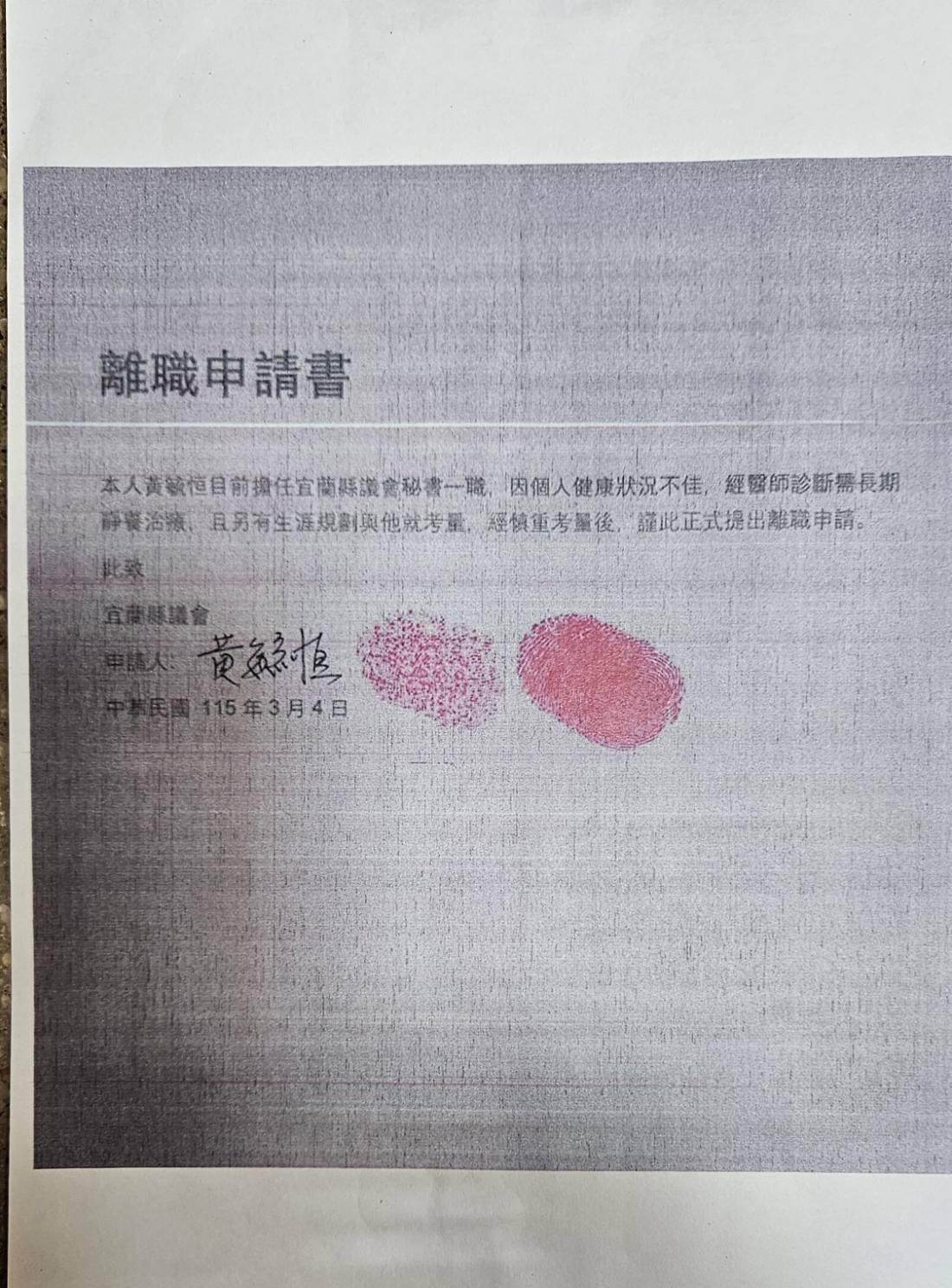 議會4日下午公布黃的離職申請書,內容寫道「本人黃毓恒目前擔任宜蘭縣議會秘書一職,因個人健康狀況不佳,經醫師診斷需長期靜養治療,且另有生涯規劃與他就考量,經慎重考量後,僅此正式提出離職申請」,簽名外也蓋手印,日期為115年3月4日。