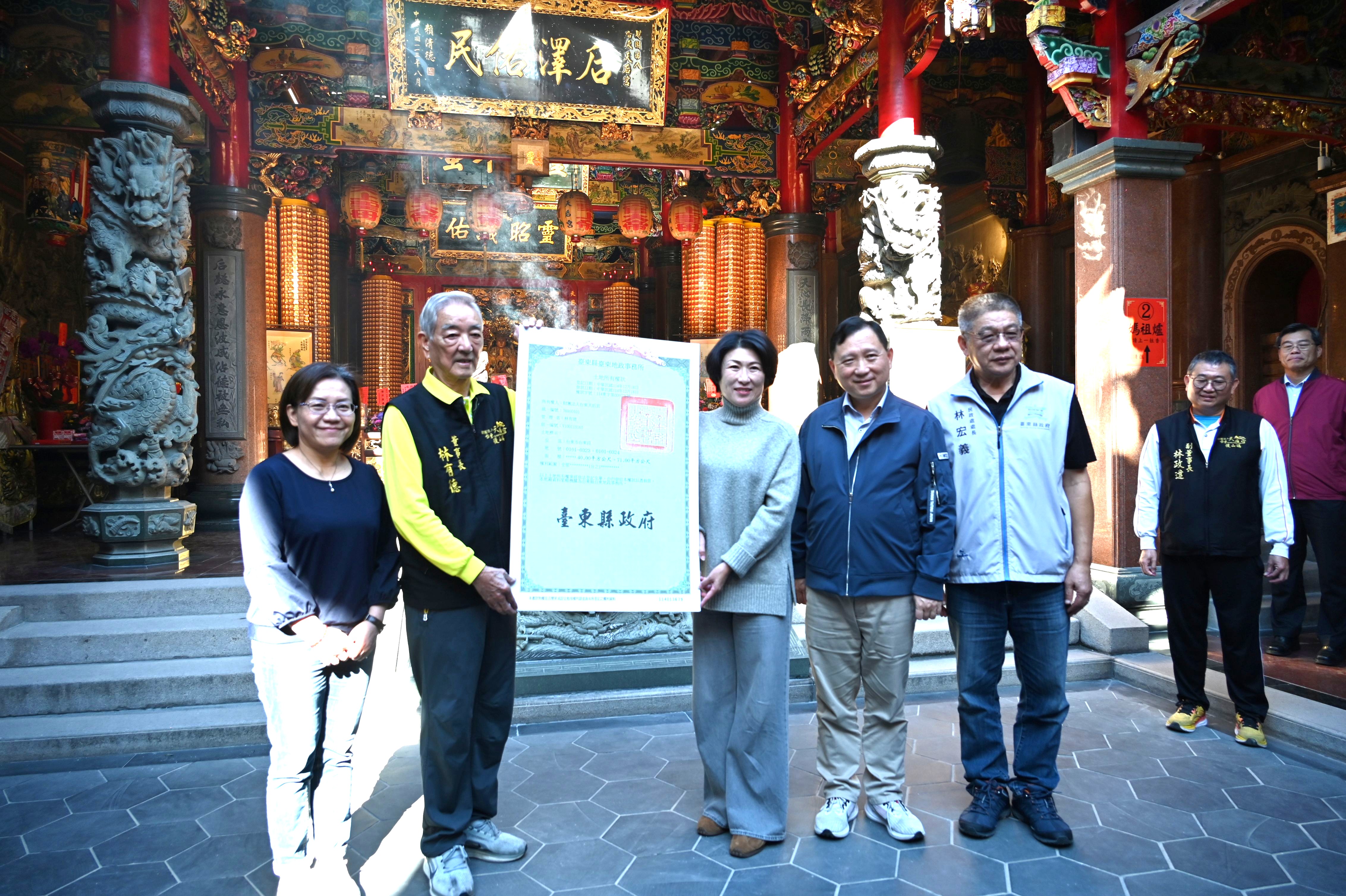 臺東縣政府與財團法人臺東天后宮今(30)日舉辦縣有土地贈與儀式,由縣長饒慶鈴代表縣府,將縣有土地台東段101-323、101-324地號等2筆土地(倉庫)權狀正式贈與臺東天后宮。饒慶鈴表示,因歷史因素,部分廟地曾被列為國有地或於戒嚴時期由軍方借用,縣府持續協助釐清土地沿革並依法辦理返還作業,此次完成贈與,是縣府第三度協助天后宮取得原使用土地。