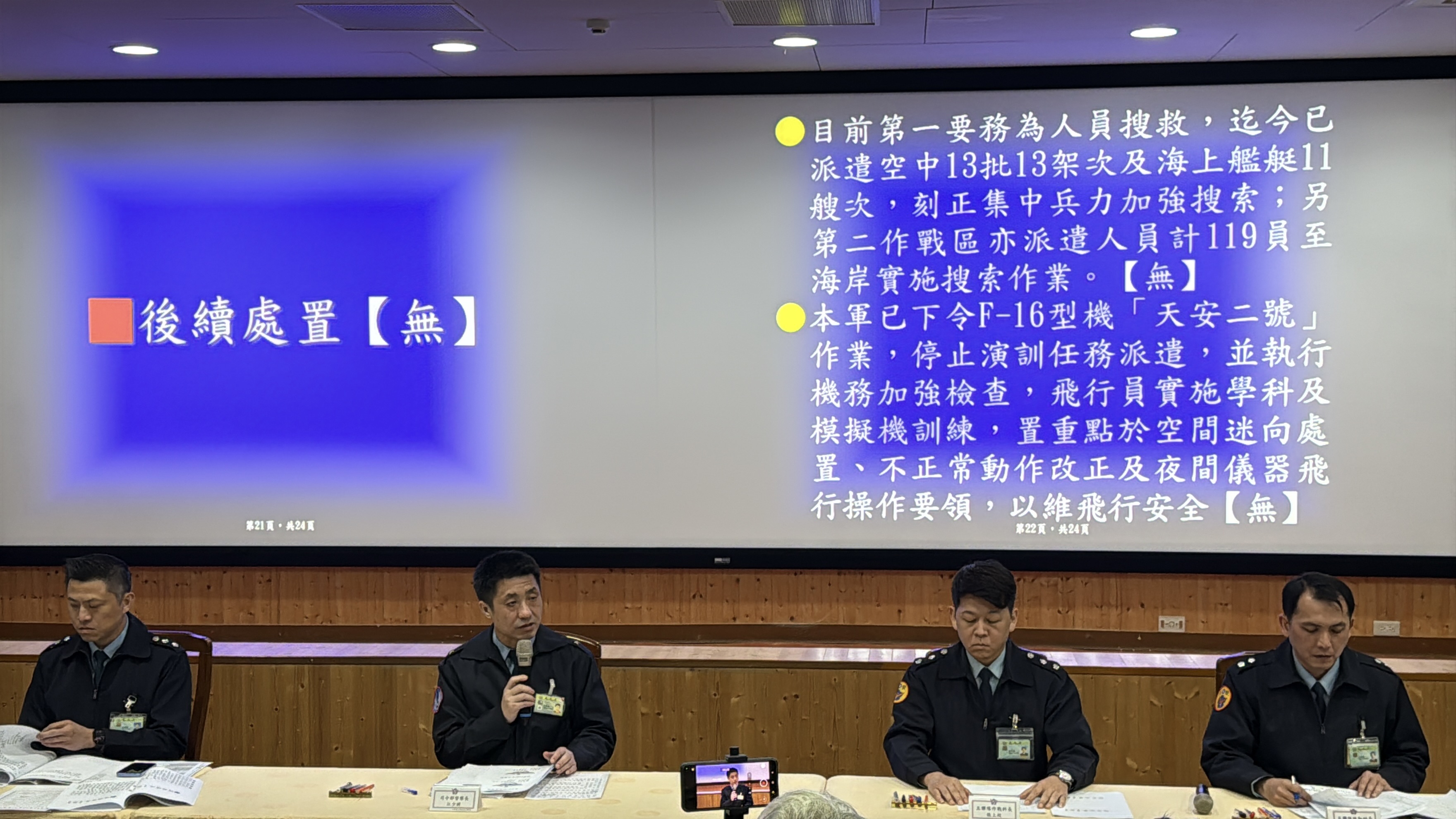 空軍司令部今(7)日召開緊急記者會,針對昨晚花蓮外海F-16戰機失聯事件公布最新進展。會議由督察長江義誠少將主持,他指出,空軍第五聯隊一架編號6700的F-16單座戰機,於1月6日晚間執行夜間訓練時在花蓮基地南面海域失蹤。國軍已動員海空兵力展開大規模搜救,並啟動「天安2號」計畫,下令全台F-16戰機暫停訓練,全面進行機務特檢。