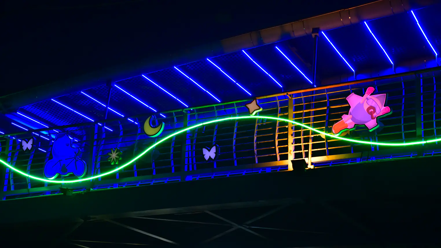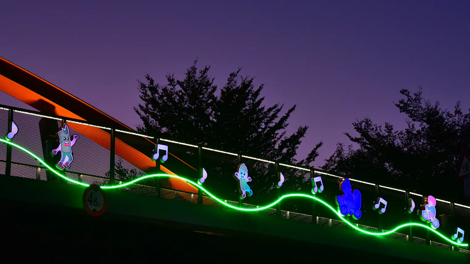 此外,燈箱設計融入富有活力的圖像元素,包括自行車、律動音符與舞動身影等圖案,象徵騎乘節奏與休閒活力。夜幕降臨時,燈光與圖像交織出動感的光影氛圍,彷彿在綠園道上演一場輕快的光影節奏,讓騎士在前行之間感受活力與趣味。