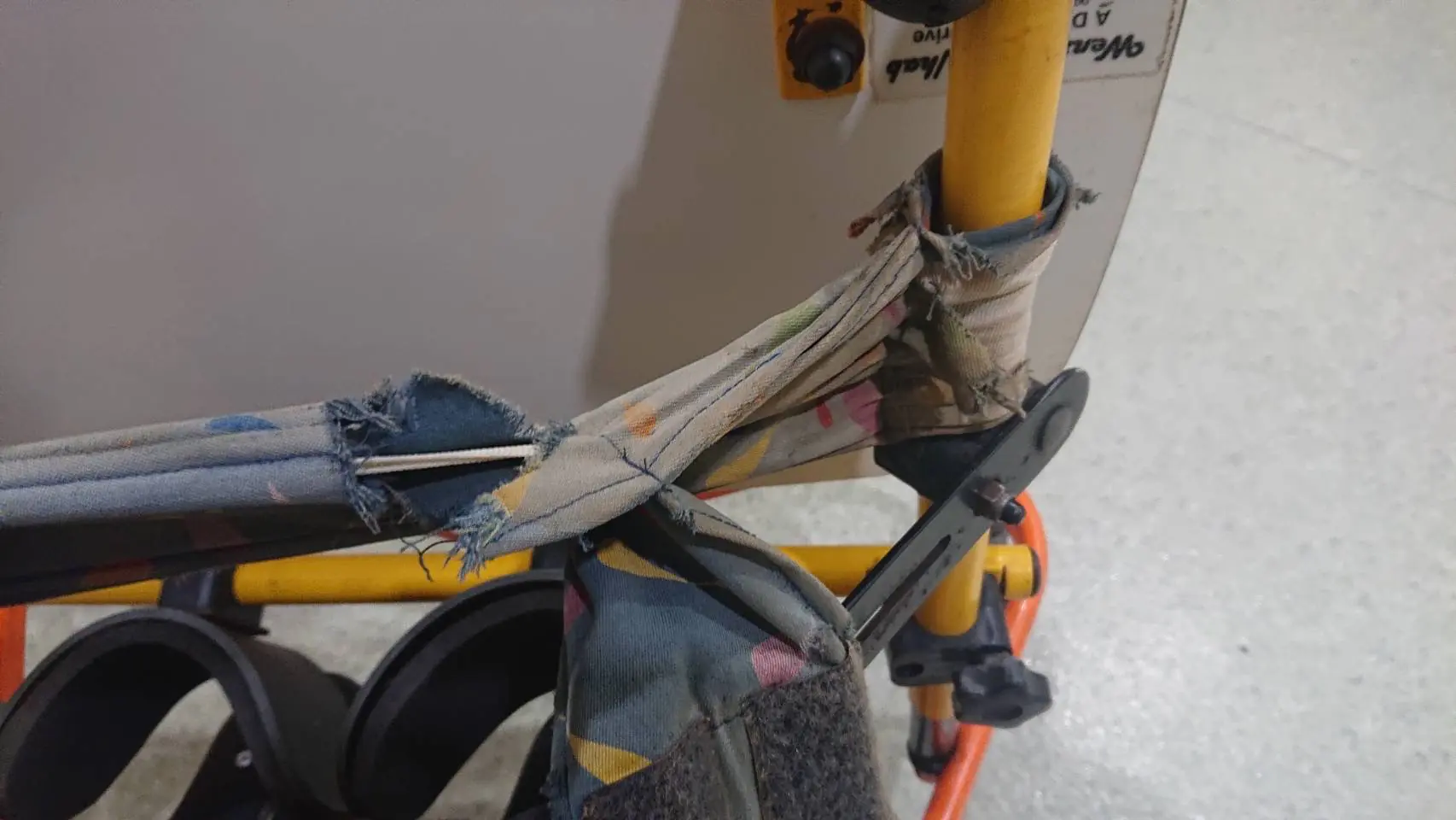 破損的早療輔具綁帶,經阿萬師媒合修復,讓孩子能安心持續訓練