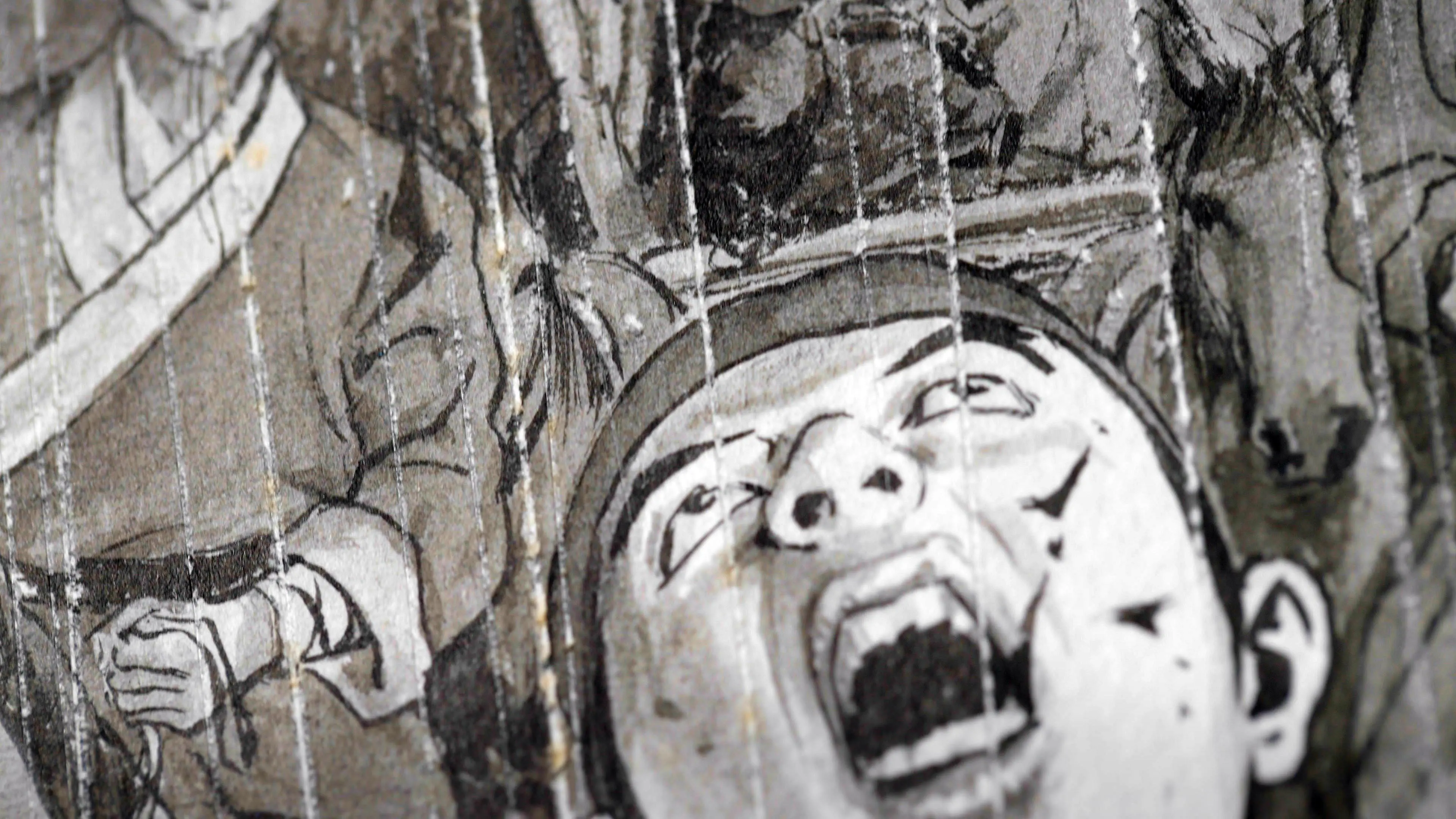 《赤狐》(1992)原作可見陳弘耀「狠心破壞原稿式」的作畫方式,用刀片切掉部分水彩紙、粘上宣紙,再用刀割出細細的雨絲,做到他要的效果。圖片提供 :公視