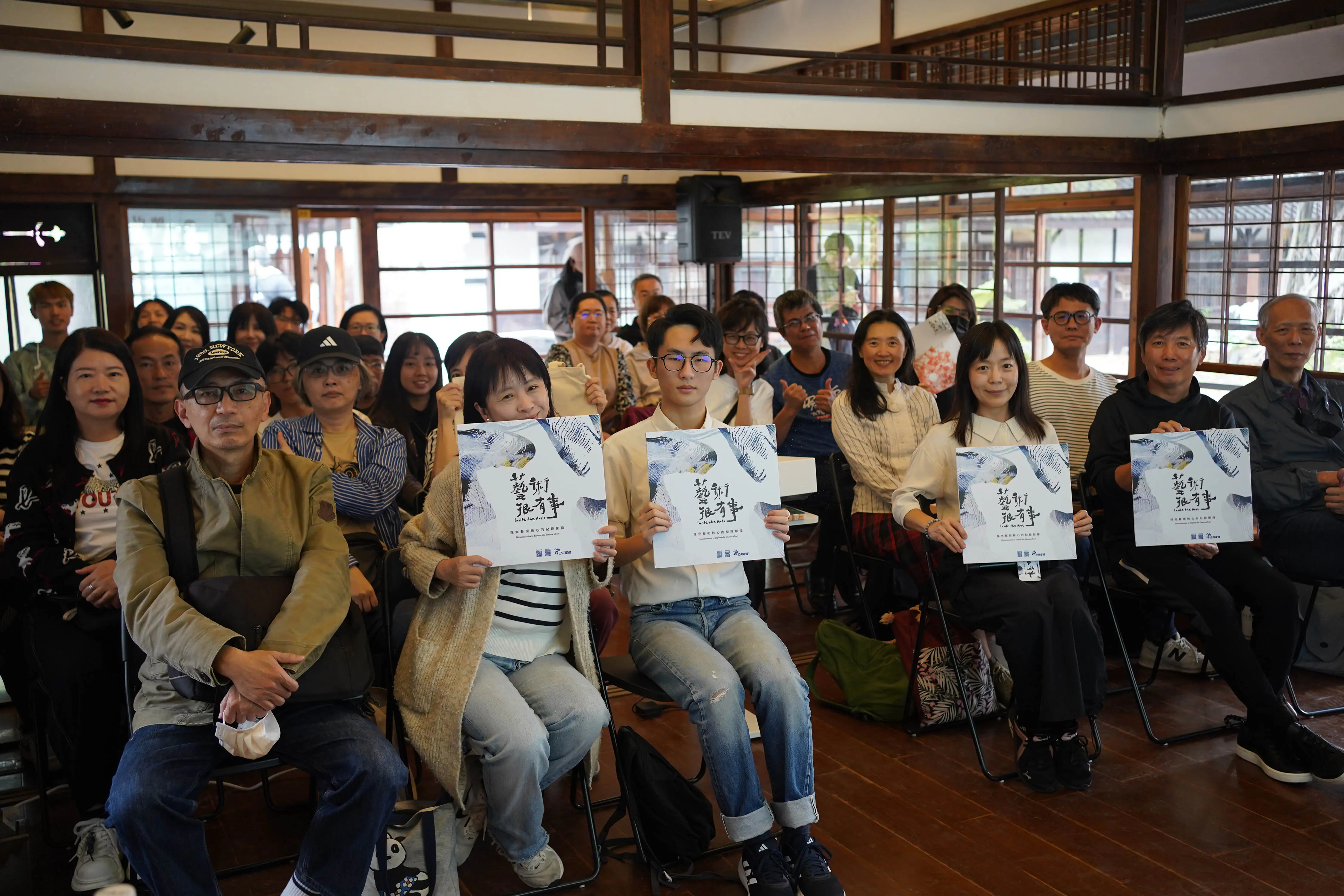 《藝術很有事》與國家漫畫博物館籌備處合辦搶先看首映會。第一排左起為好友艾爾先生、陳弘耀的妻子兼經紀人鄭詠中及兒子,《藝術很有事》製作人徐蘊康、《漫畫之友》創辦人黃熙文、李俊隆。圖片提供:公視