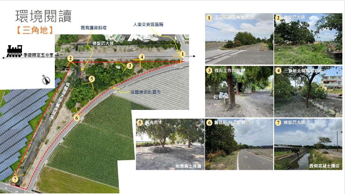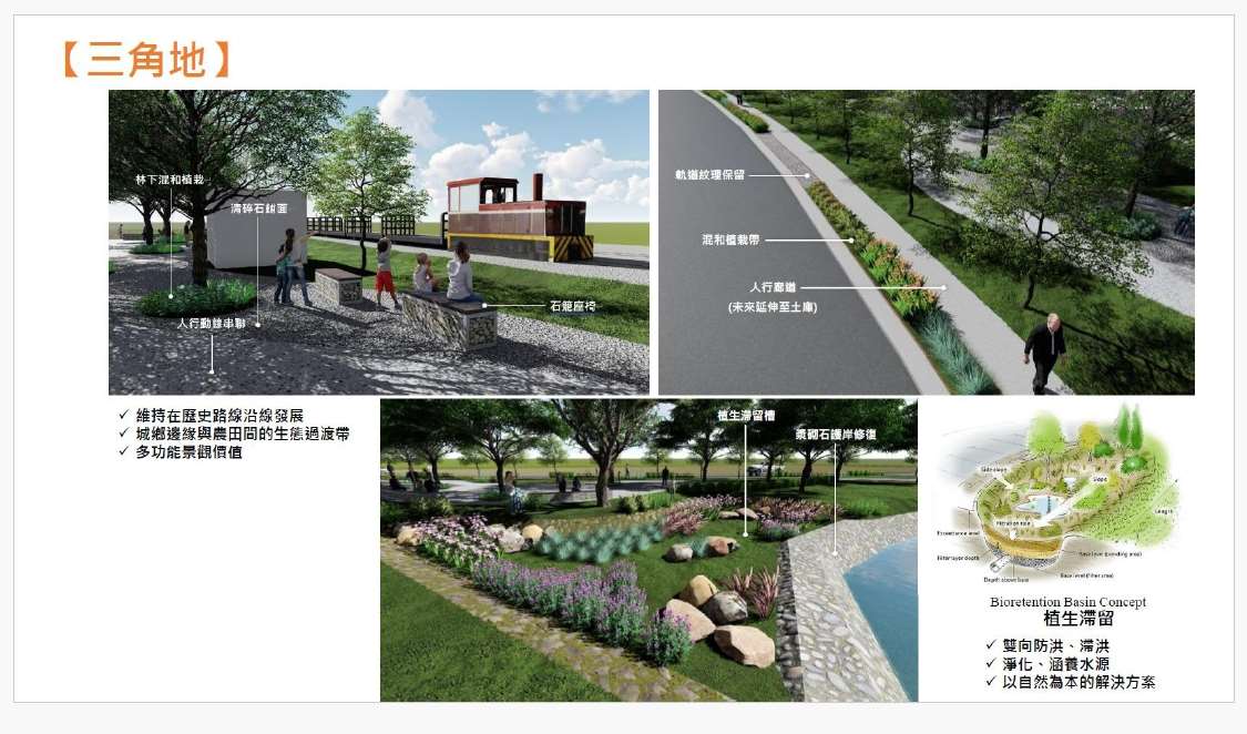 本計畫將以棋盤厝大排(舊虎尾溪)及馬公厝支線為主要藍帶系統,結合既有綠地資源與人行動線,串聯軌道兩側空間,並以三角地區作為重要節點,建構「城際藍綠縫合要塞」,向南延伸連結土庫方向,形成完整的藍綠廊道網絡。同時,亦將整合舊糖鐵資源,營造特色景觀軸線,讓歷史產業軌跡融入現代生活場景。