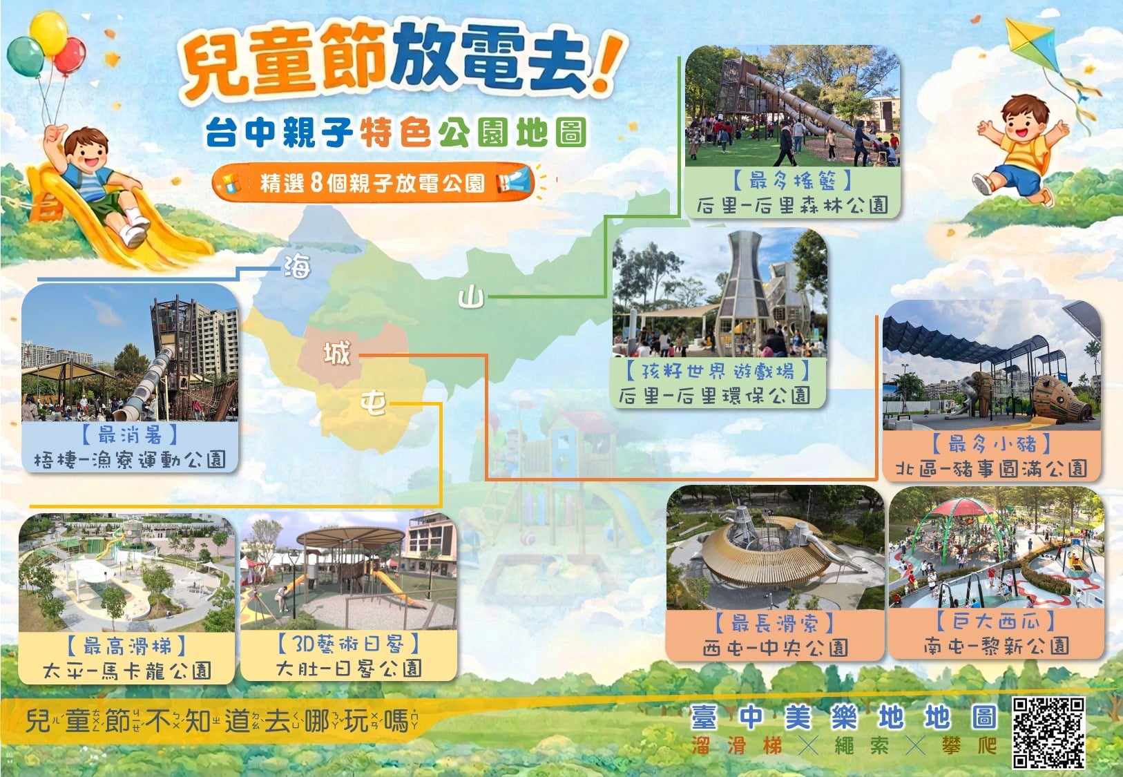 建設局長陳大田指出,今年連假長達4天,非常適合闔家走訪台中各地美樂地公園遊戲場踩點遊玩。市府特別精選8大人氣美樂地公園,打造「山、海、屯、城親子放電路線」,各具特色、精彩可期。