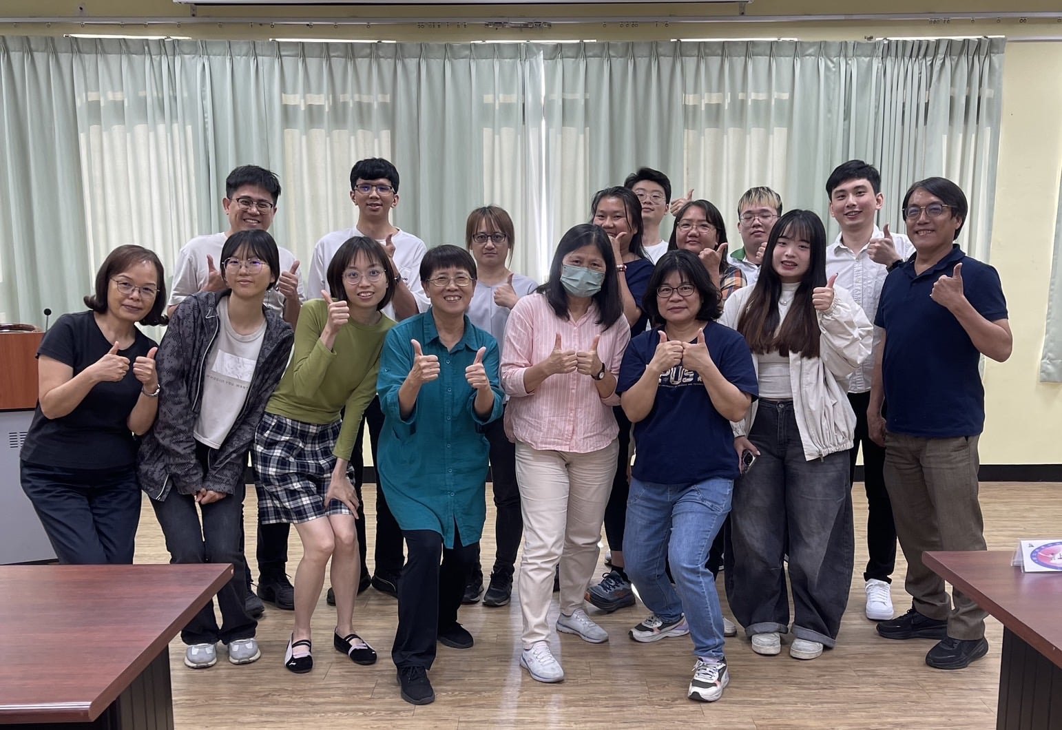 屏科大社工系碩班師生公開發表社工日「守護社會安全網,拒絕讓社工成為體制傷痕的替罪羔羊】聲明,左四起張麗玉主任、張麗珠副教授,後排右二學諮中心黃上豪主任等。/ 圖 游宏琦 攝