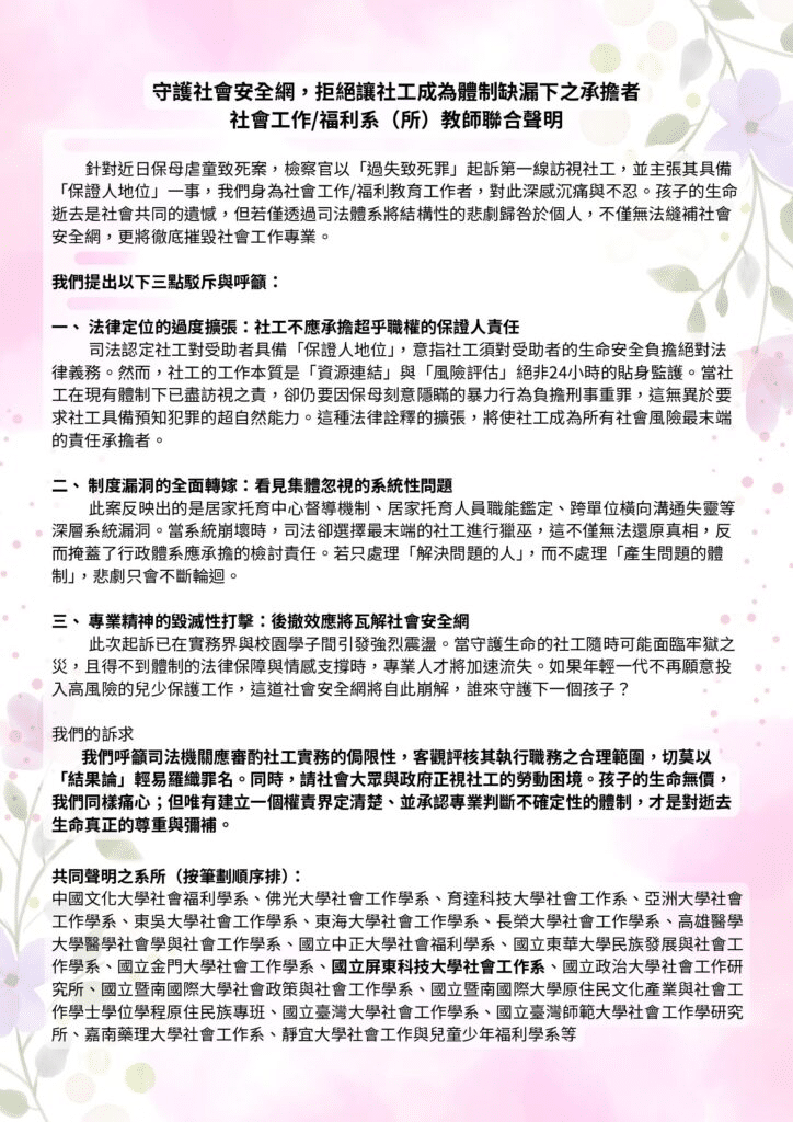 此次聯合聲明以「守護社會安全網,拒絕讓社工成為體制缺漏下之承擔者」為題,由全台20個社會工作與社會福利相關系所共同發起,直指本案所牽動的,已不只是單一案件的司法爭議,更涉及社工專業定位、兒少保護制度與整體社會安全網的未來。