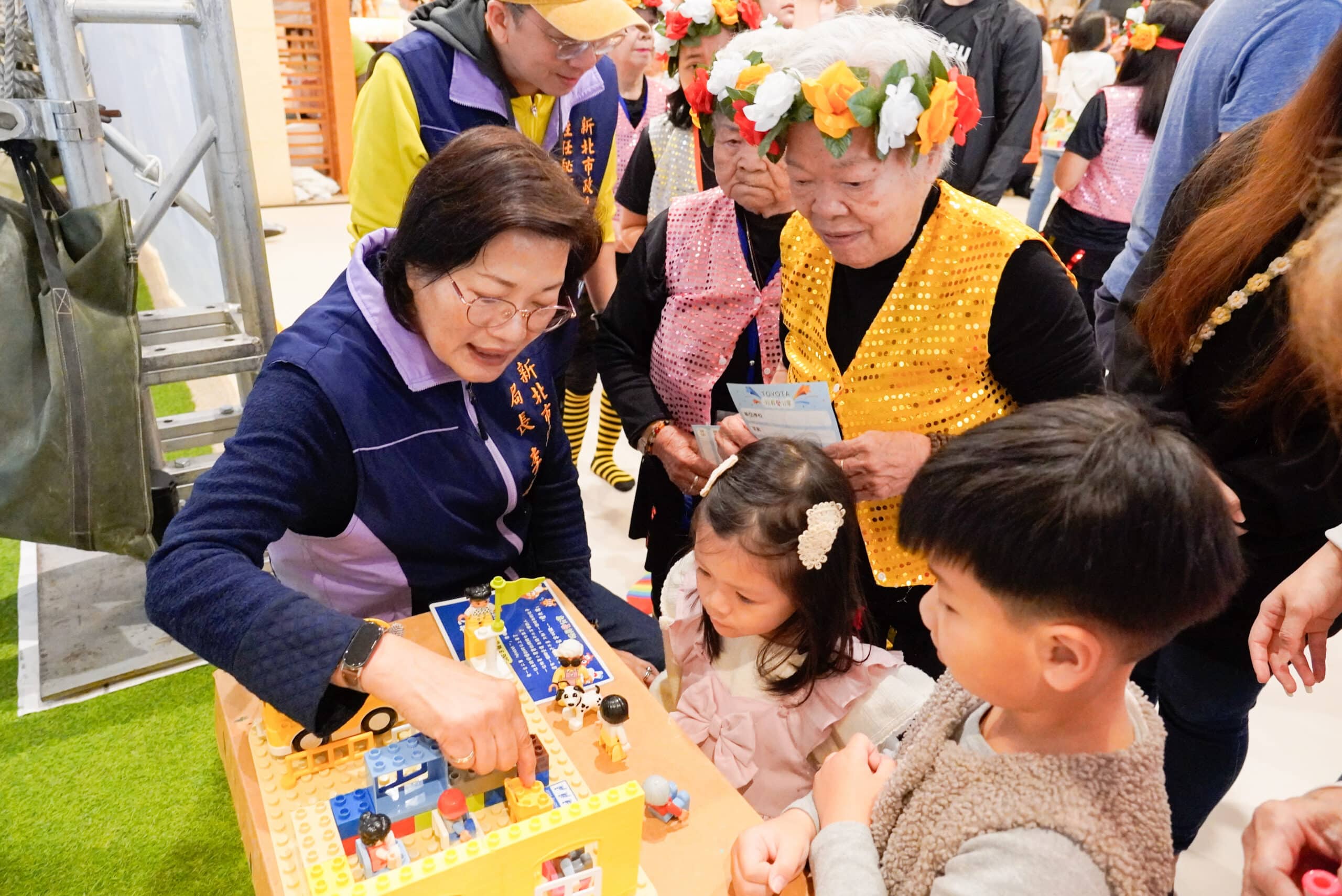 新北社會局長李美珍和馨窩長輩與小朋友共玩。(新北市社會局提供)