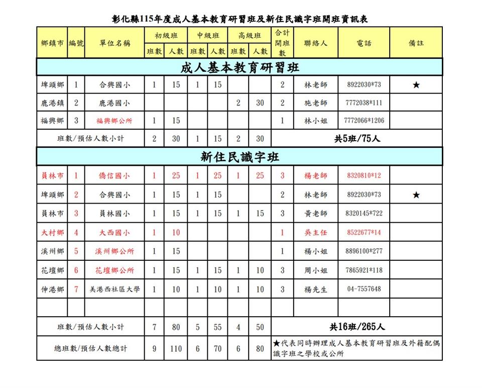 為提升失學國民及新住民的聽、說、讀、寫能力,強化基本生活知能,彰化縣政府特別規劃「115年度成人基本教育研習班及新住民識字班」,協助學員增進自我能力。本年度共開設21班課程,包含成人基本教育研習班5班及新住民識字班16班,每班課程時數為72小時。開課單位遍及縣內多處,包括3個鄉(鎮)公所(福興鄉、溪州鄉、花壇鄉)、5所國小(鹿港國小、僑信國小、員林國小、合興國小及大西國小),以及1所社區大學(美港西社區大學,設於伸港國中),歡迎有需要的民眾逕洽各開班單位報名。