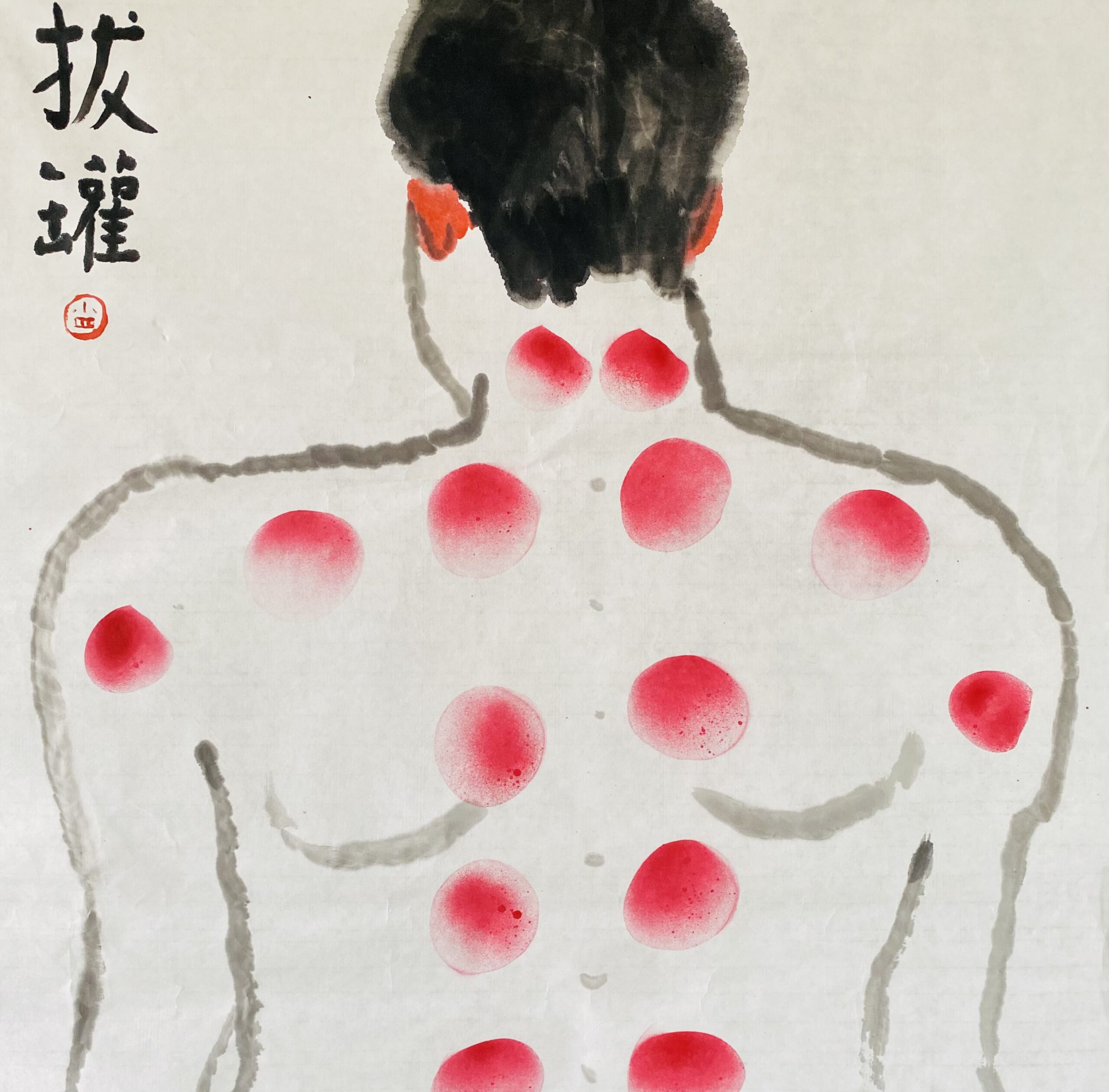 蔡宗祐,〈拔罐圖 〉,2023,水墨、噴漆、水性顏料,70×69 cm,藝術家自藏。圖片來源:藝術家提供