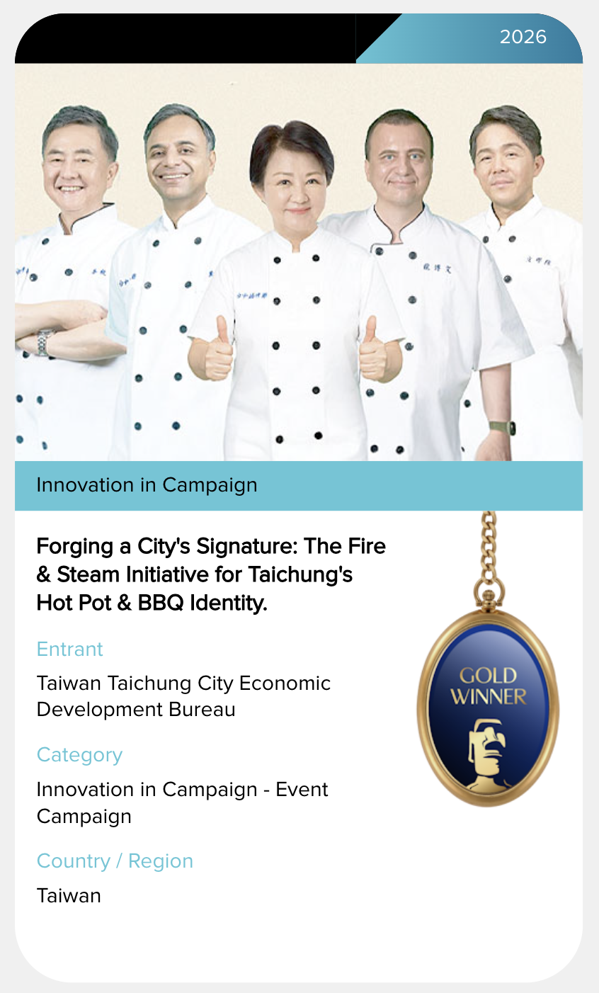 「鍋烤之都在台中」獲國際肯定!台中市政府經濟發展局以鍋烤節為主軸,參加2026年國際泰坦創新大獎(TITAN Innovation Awards),以「Forging a City’s Signature: The Fire & Steam Initiative for Taichung’s Hot Pot & BBQ Identity」為題勇奪金獎殊榮,不僅讓台中城市品牌成功登上國際舞台,也展現市府推動產業與城市行銷的創新能量與執行實力。