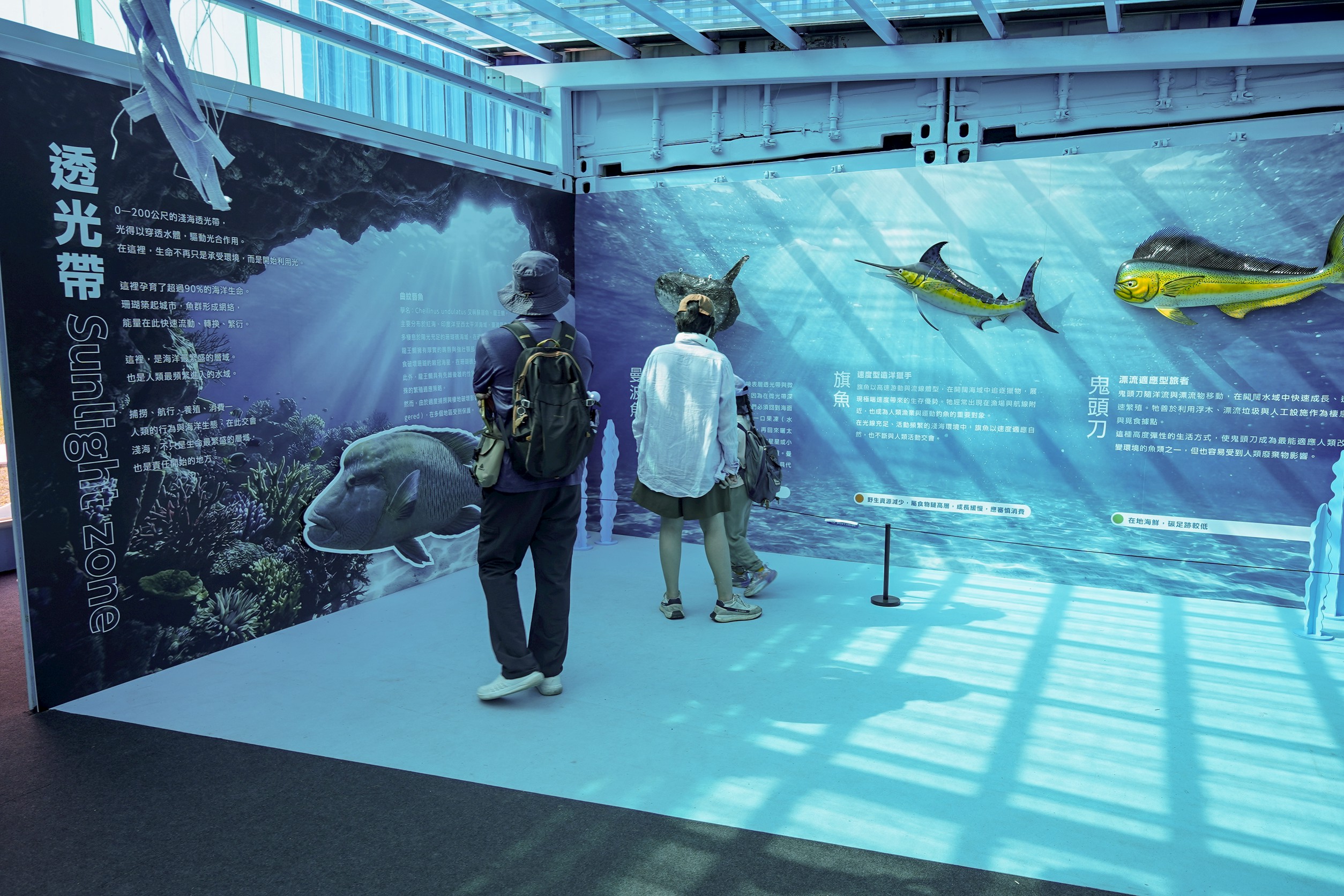 第三階段【迴響】:淺海透光帶的競爭與海洋永續政策─掀開展區簾幕,迎面而來的是明亮溫暖、水深200公尺內的「淺海透光帶」。這裡不僅孕育了超過90% 的海洋生命,更是人類活動與海洋生態最頻繁交匯的地帶。在曲紋唇魚(蘇眉魚)的帶領下,觀眾將逐一認識曼波魚等餐桌上常見的洄游魚類,並學習如何運用「永續海鮮選擇指南」。此外,展區也特別引介灃食公益飲食文化教育基金會編纂的《台灣海魚家族》與《台灣養殖魚家族》,帶領大家認識台灣周邊海域中,建議民眾優先選擇的魚蝦種類。