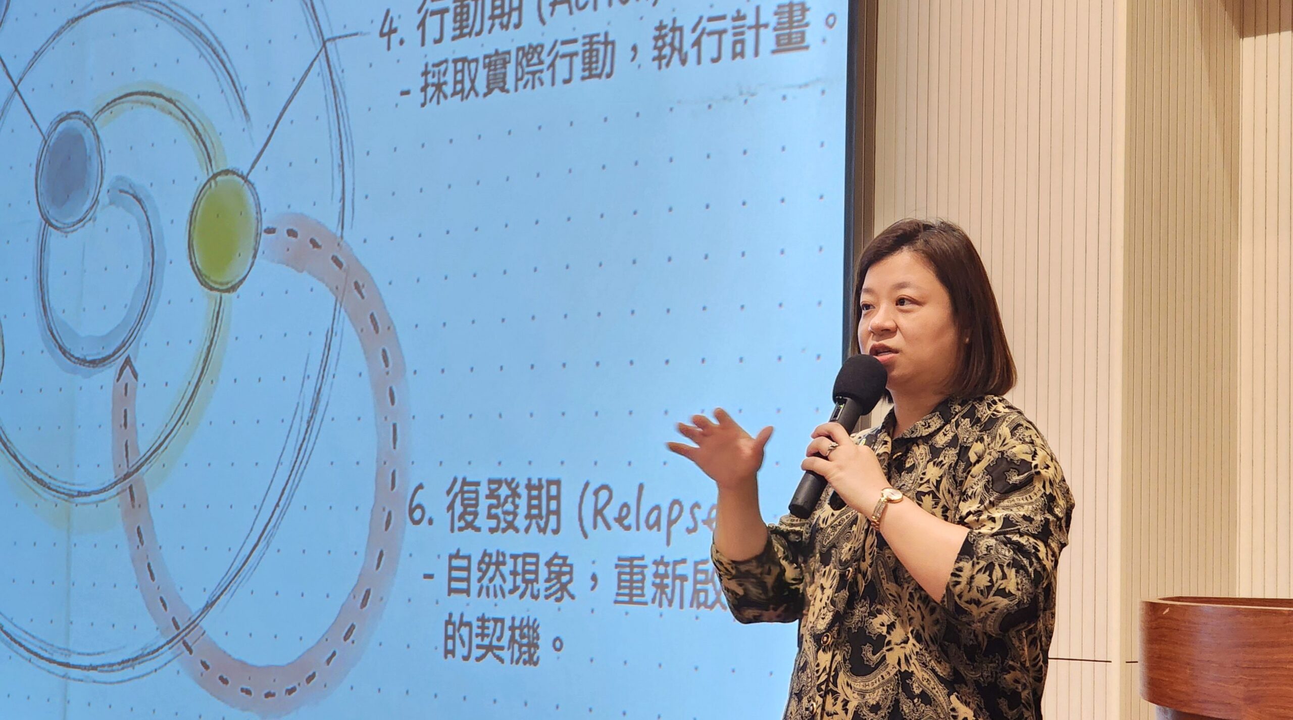 奇美醫院健康促進組組長王美仁講述課程主題「生活型態教練的角色與行為改變技巧應用」,分享如何透過陪伴與溝通,協助民眾將健康建議落實於日常。(奇美醫提供)